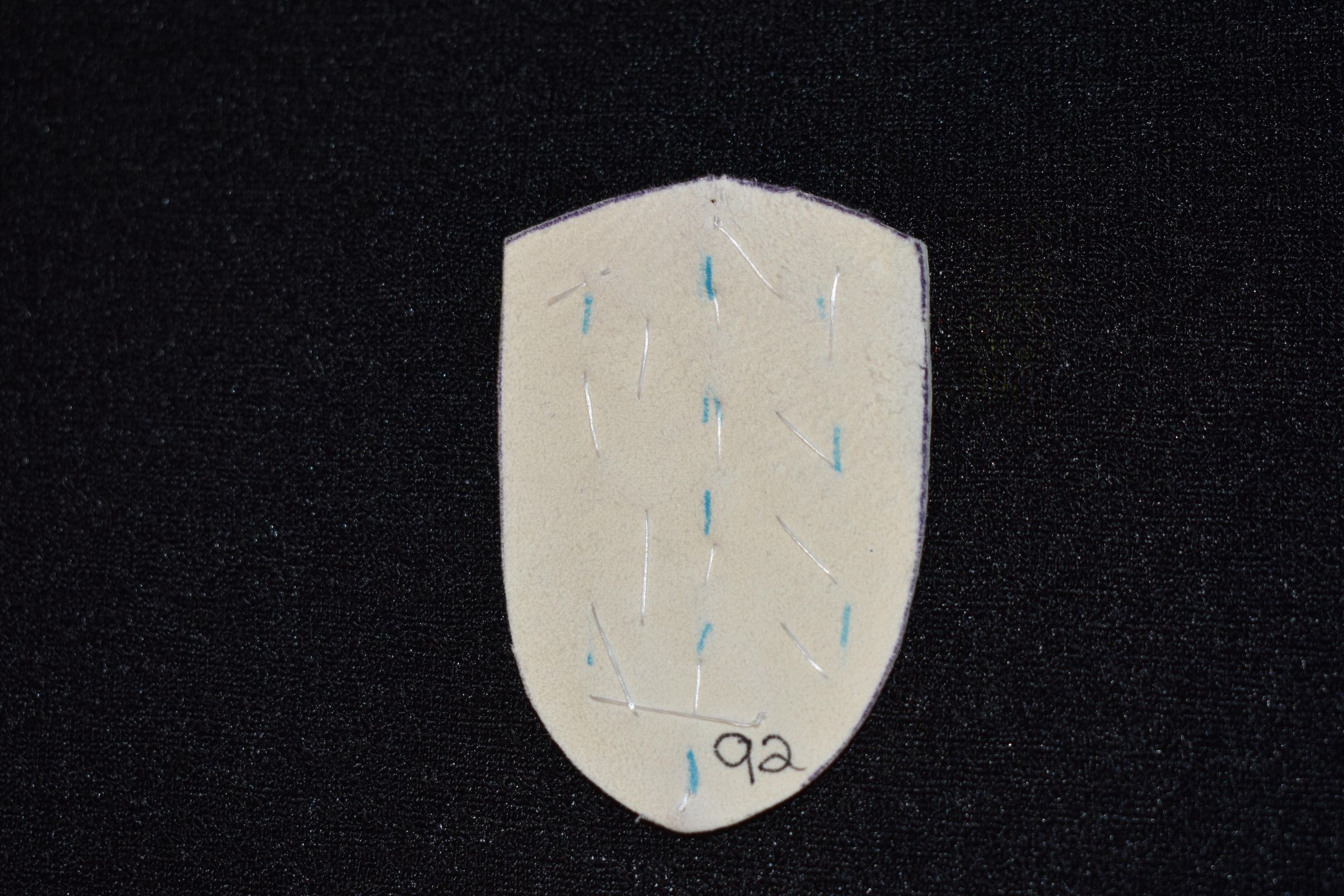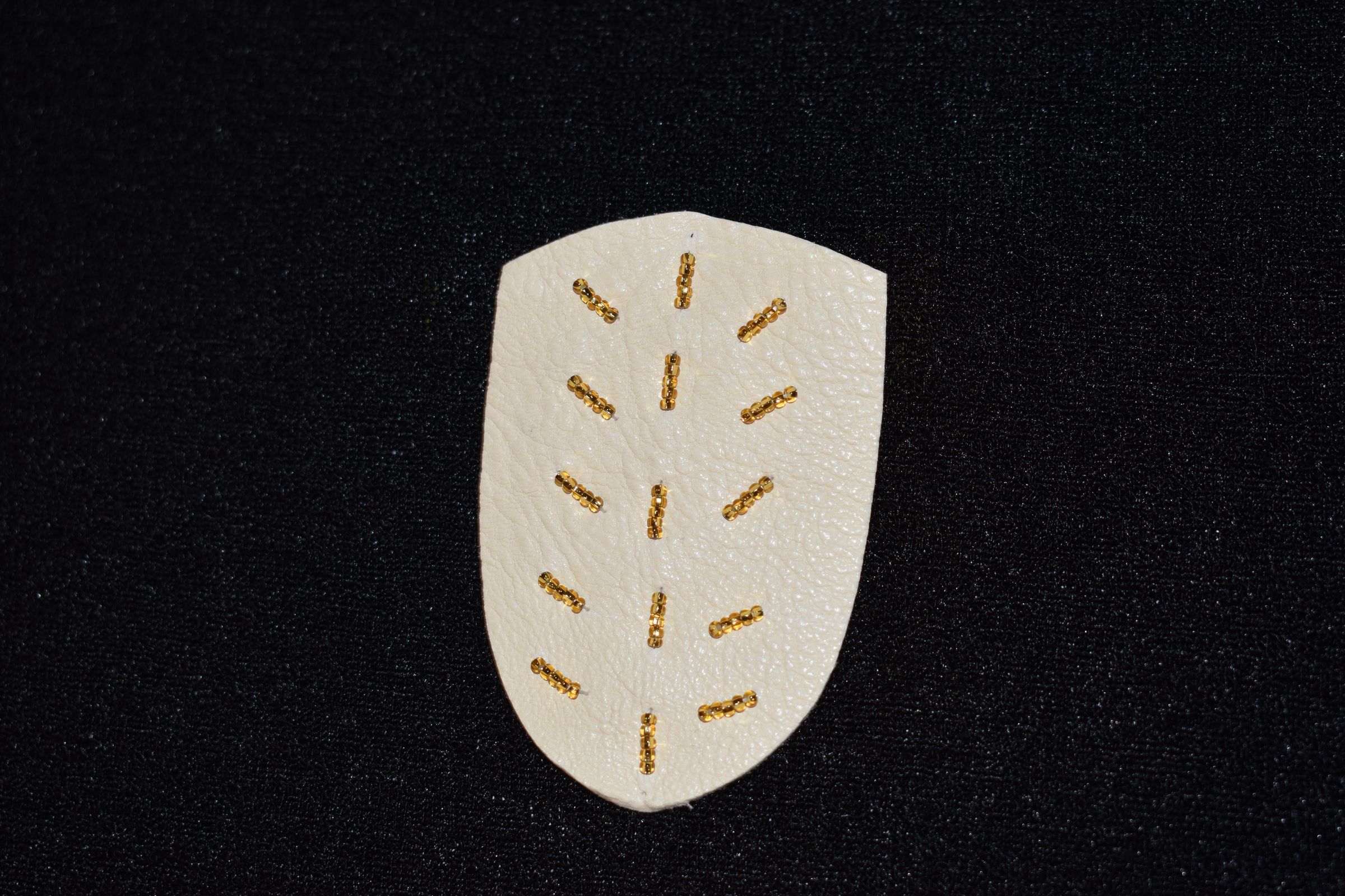Vamp donated by Jackie Cree. Gold beads on leather.