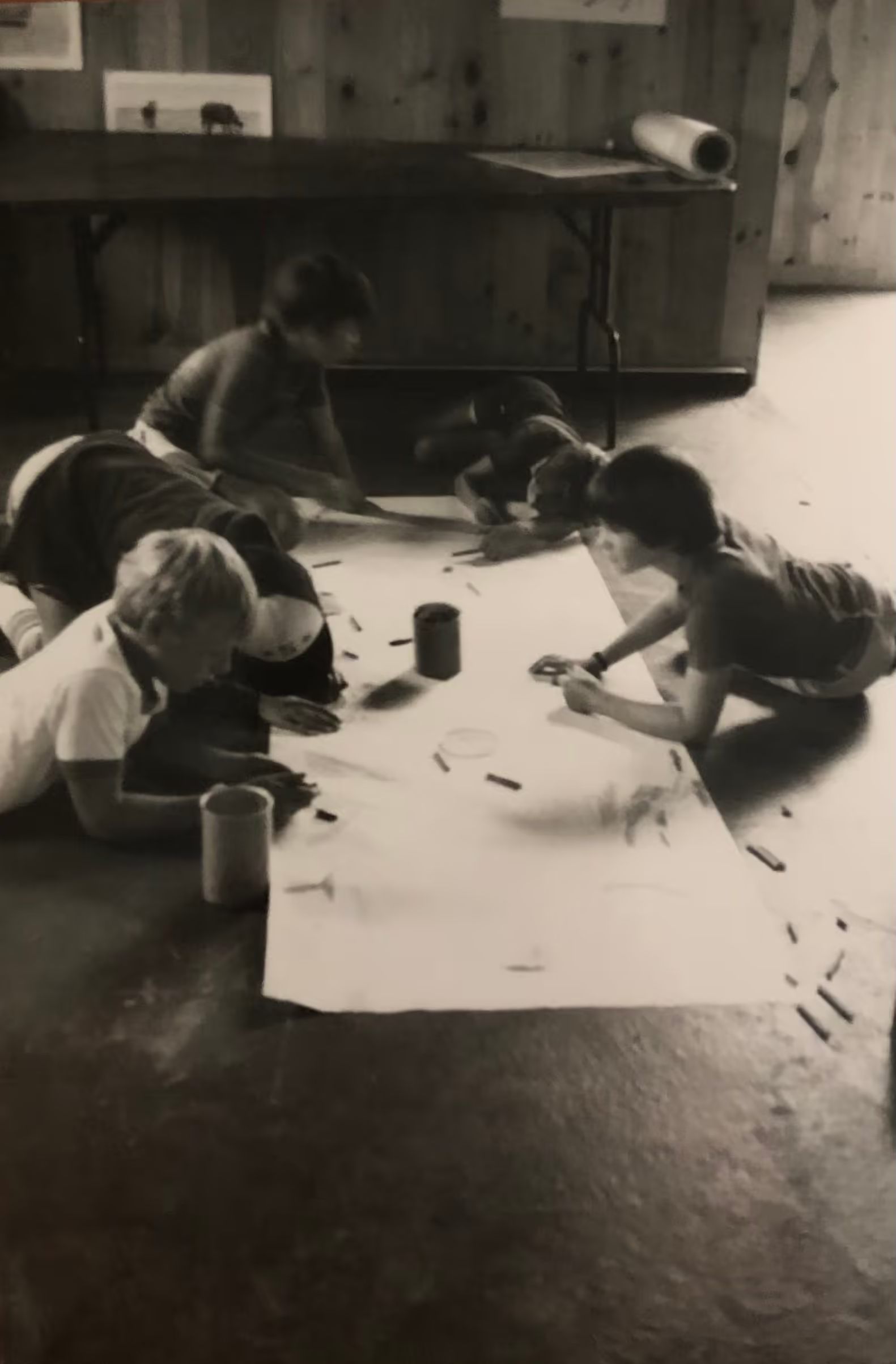 Campers working on an art project on the floor of the Barn.