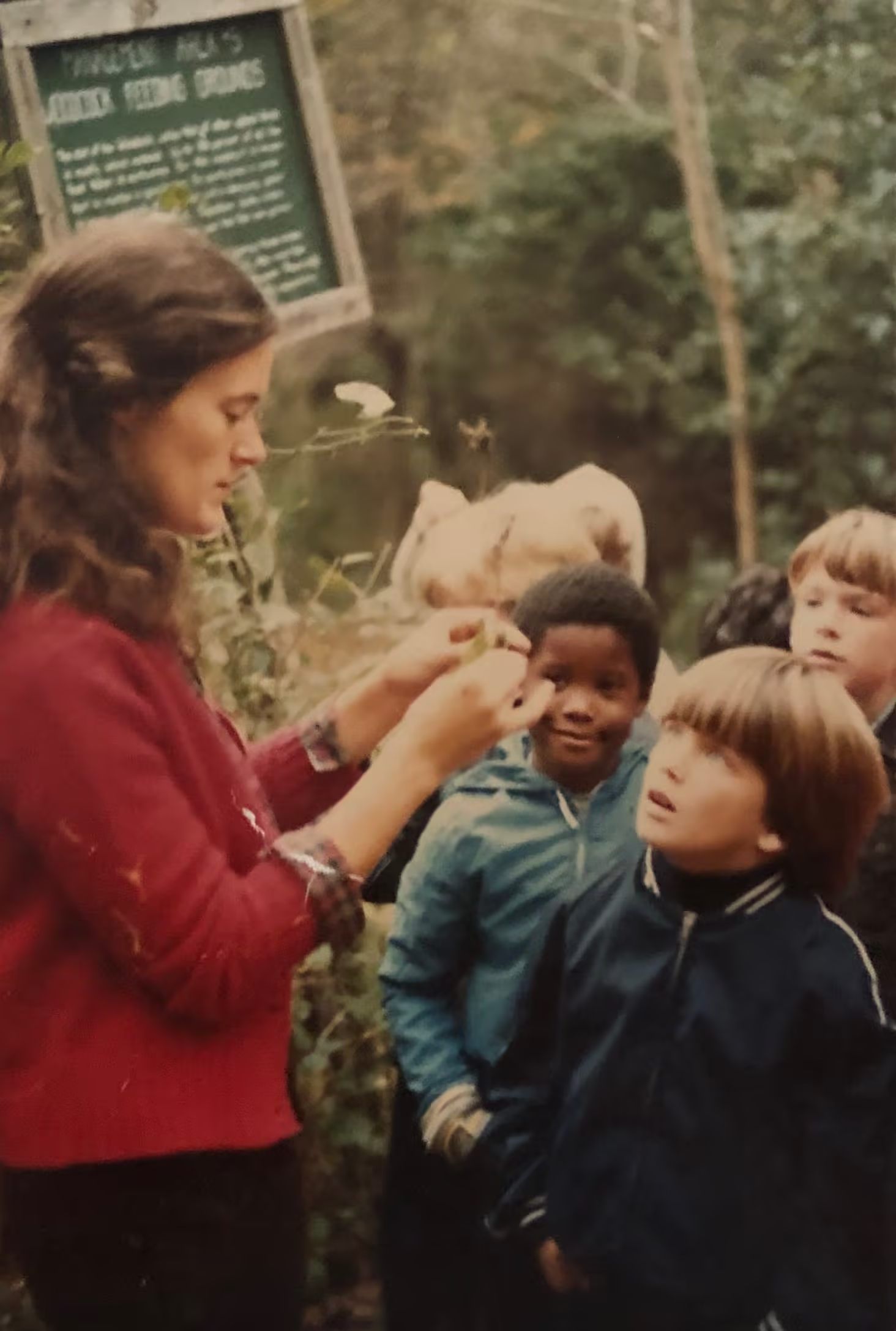 Former Executive Director and Teacher Naturalist, Delia Clark, with students on the trail.Created By
