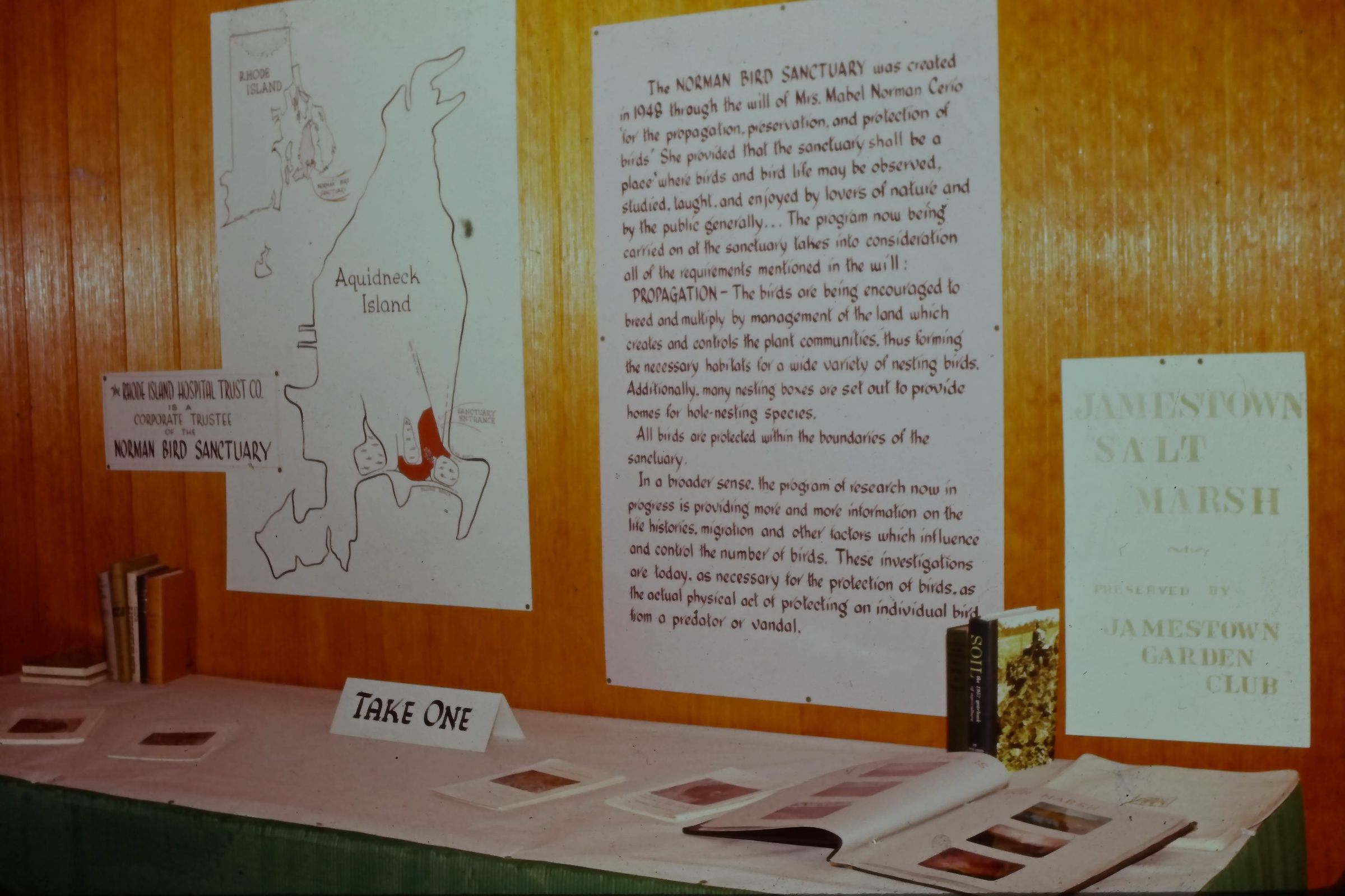 Informational display on research and conservation efforts at the Sanctuary, and Jamestown Salt Marsh informational materials. Displayed in Barn, formerly the Welcome Center.Collection