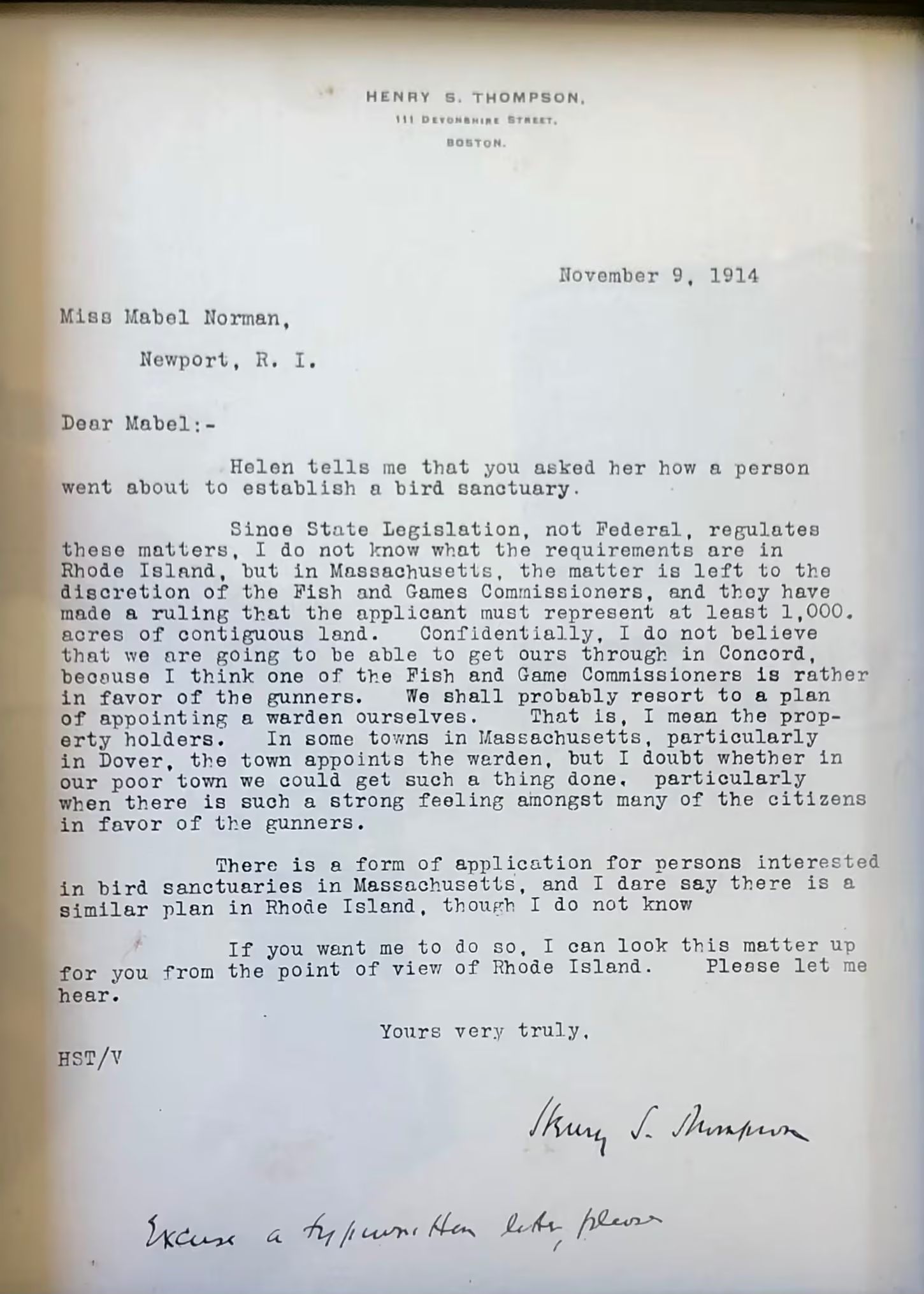 Letter from Henry S. Thompson to Mabel Norman regarding her interest in establishing a bird sanctuary. Archival letters indicate that Mabel was researching this extensively at the time, eager to protect the open land for wildlife decades prior to the establishment of NBS.Collection