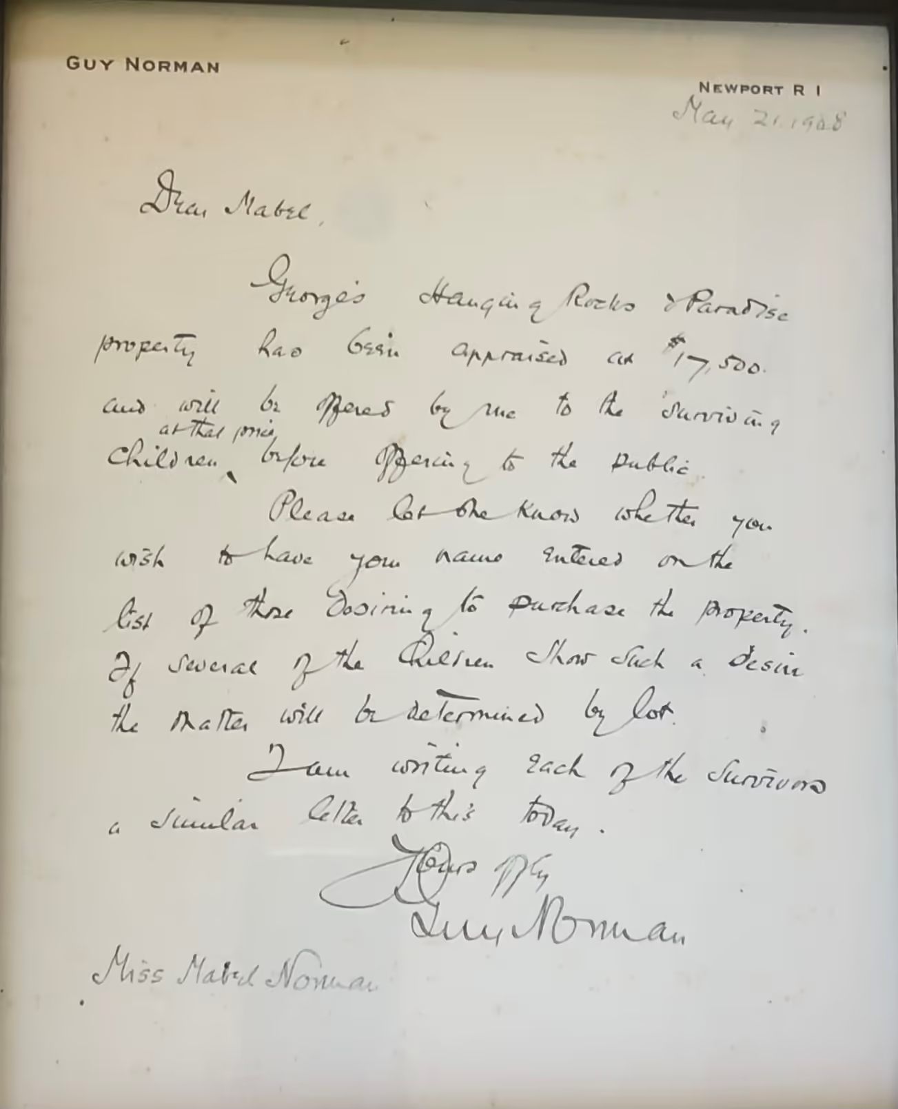 Letter from Guy Norman to his sister, Mabel, sharing the appraised value of the "Hanging Rocks & Paradise property...at $17,500" and officially extending Mabel the option to purchase. Guy notes the option is being extended to all surviving children. Mabel would go on to purchase the property less than one month later.Collection
