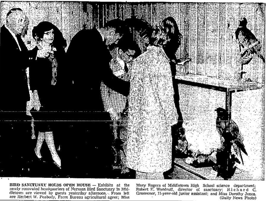 Open house of the Sanctuary's "newly renovated headquarters" in the Barn. Pictured (L-R): Herbert W. Peabody, Bureau agricultural agent, Mary Rogers of Middletown High School science department, Robert (Bob) Woodruff, director of NBS, Richard C. Grosvenor, 11-year-old junior assistant, and Dorothy Jones.Publication Details