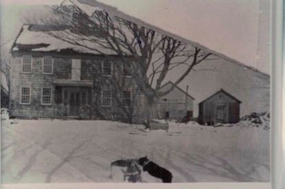 Paradise Farmhouse, facing North. Barn and auxiliary shed seen in background, with dog in foreground (likely Mabel's). Date unknown.Collection