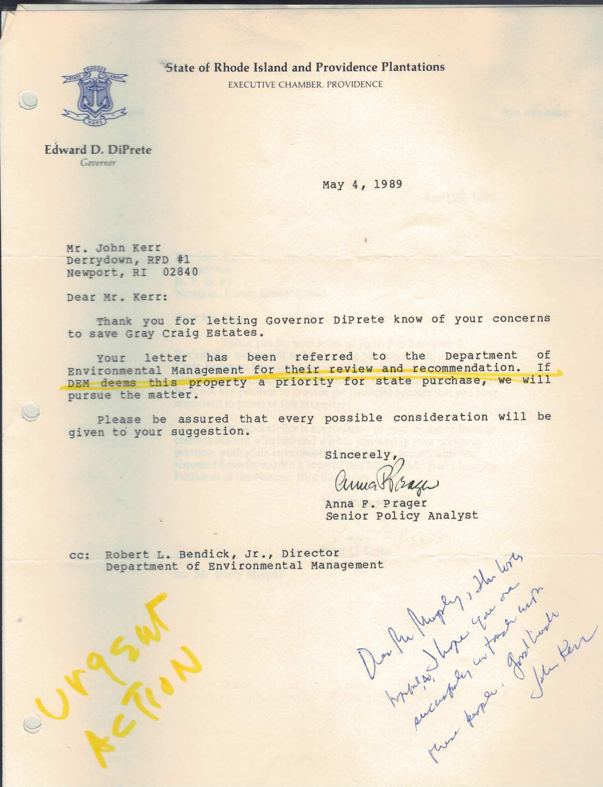 Letter from the office of RI Governor Edward DiPrete regarding efforts to save Gray Craig Estate.Collection
