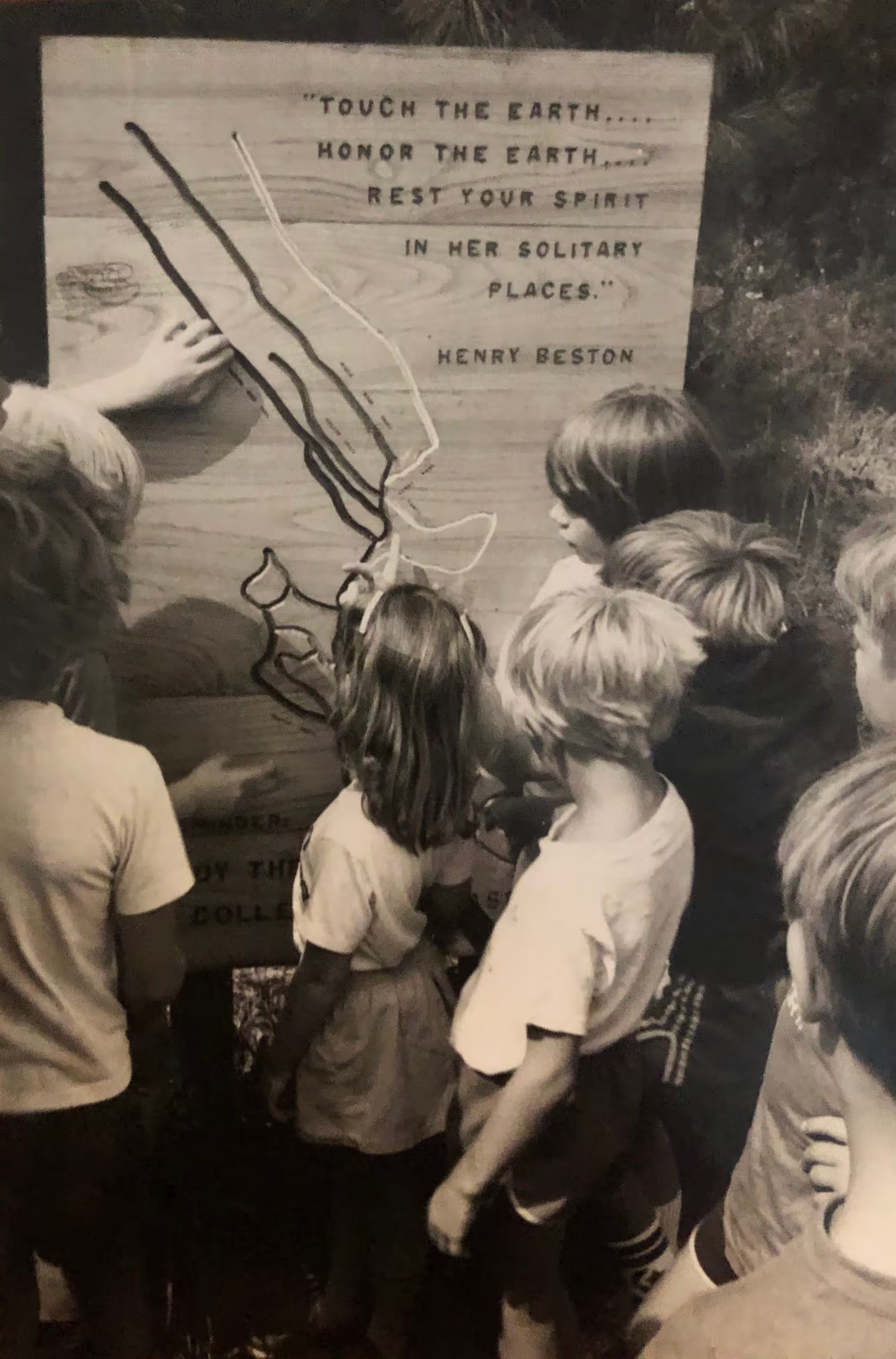 Students pose around former trail sign with quote from Henry Boston, 20th century naturalist.Created By