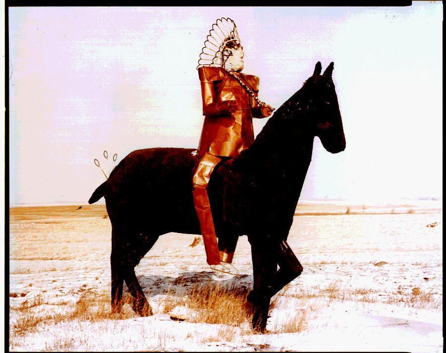 Metal Indian and Stucco Horse. US 281, Millarton, ND.2/9/81