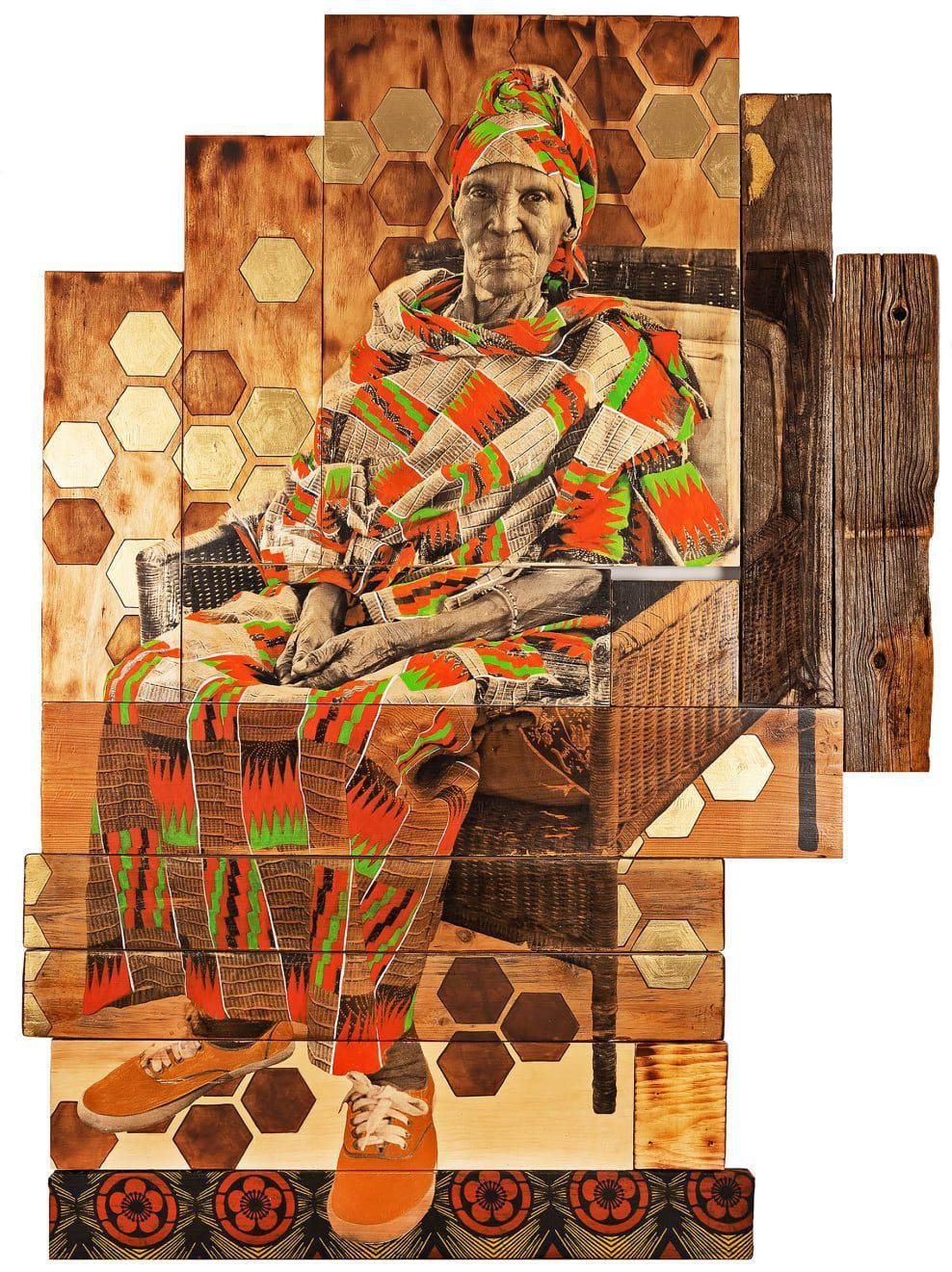 The portrait is of her grandmother Bibi, a local bee-keeper and guardian of stories. Strauss "explores family mythology and the oral tradition - how (r)evolution is embodied in the women of the African diaspora through storytelling, song and the naming of children - traversing language, geographic location and time. [...] Natural honey comb and bees pay homage to the bee-keepers among the women in my family as well as reference the significance of bees in African diasporic spiritual practices. Combining Tanzanian traditional art techniques of wood burning and woodcarving with photo-transfer and painting, the work serves as a reminder that we can call on ancestral wisdom and our legacy of revolutionary women to guide us and give us strength."Exhibition