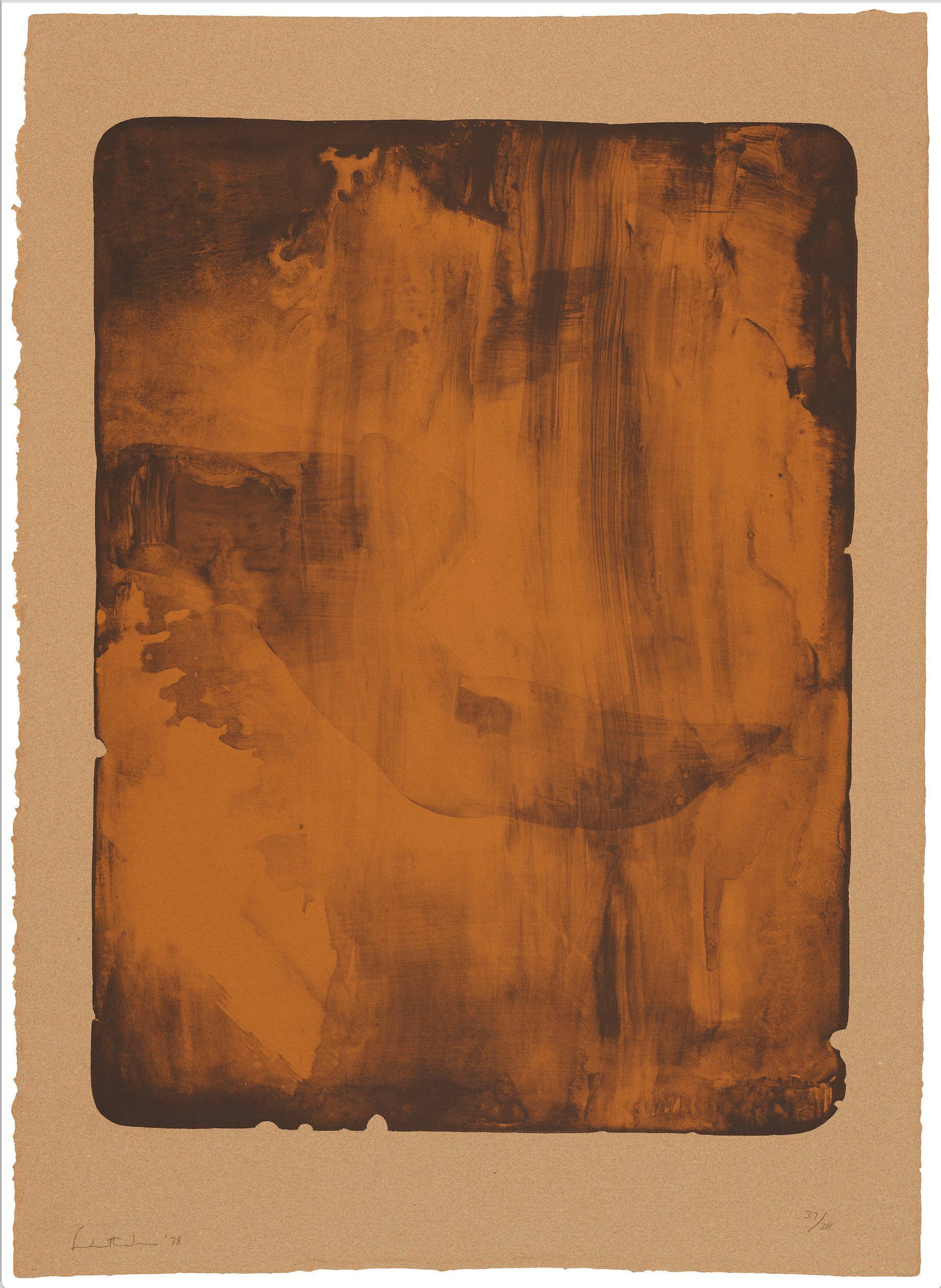 Two color lithograph on red-brown pink J.B. Green Katusah handmade paper