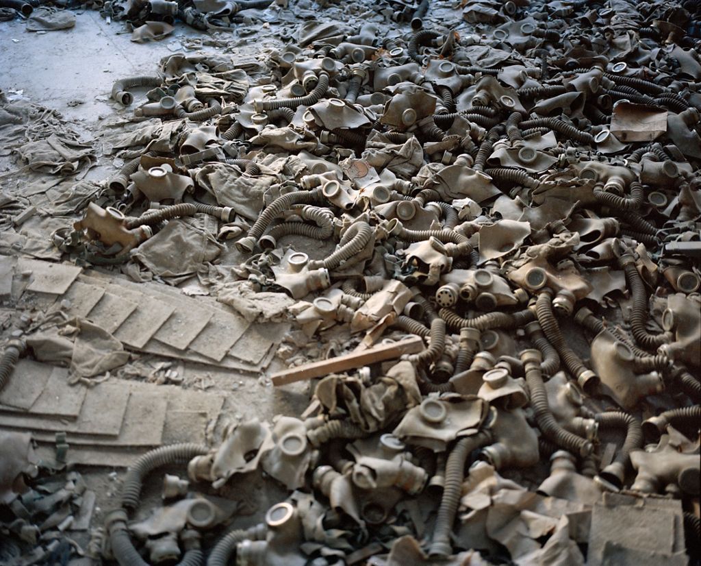 Gas masks scattered on the floor of a school lobby inthe abandoned city of Prypiat. As a result of the nuclearaccident and the subsequent radioactive fallout the entirepopulation of Prypiathad been evacuated and neverreturned home. Chernobyl, Ukraine, December 2010.Photograph Details
