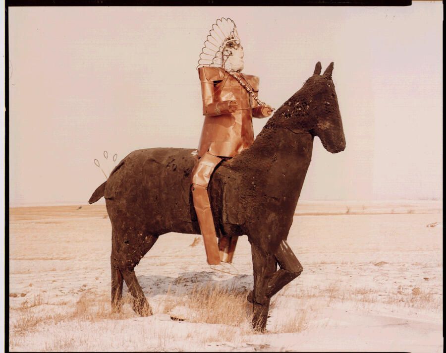 Metal Indian and Stucco Horse. US 281, Millarton, ND.2/9/81