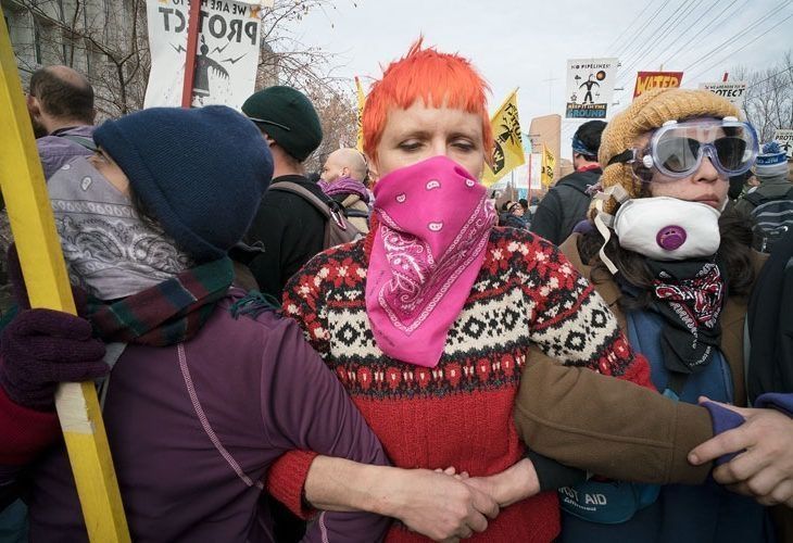 Non Native Allies Encircle Native Water Protecters To Protect Then From Possible Arrest And Harsh Legal Response Outside Bismarck Federal Building