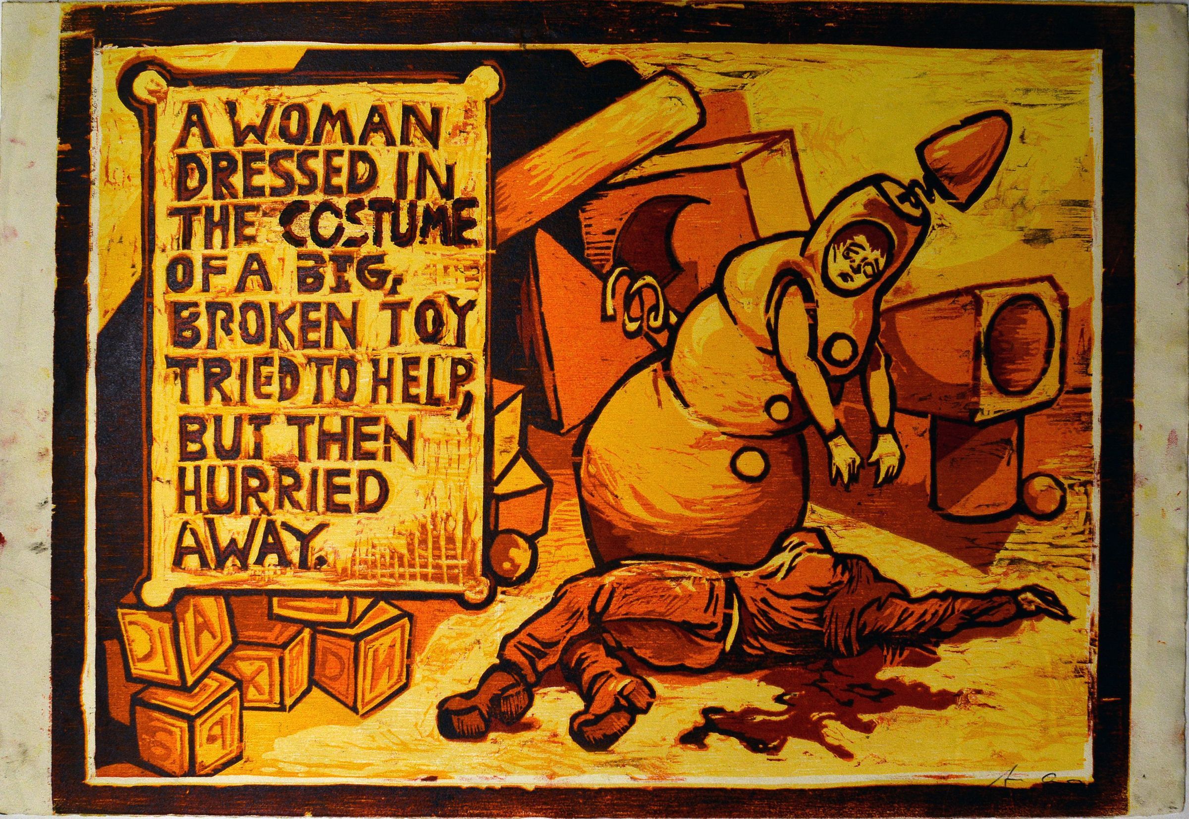 A Woman Dressed in the Costume of a Big, Broken Toy Tried to Help, But Then Hurried Away.Entry/Object ID