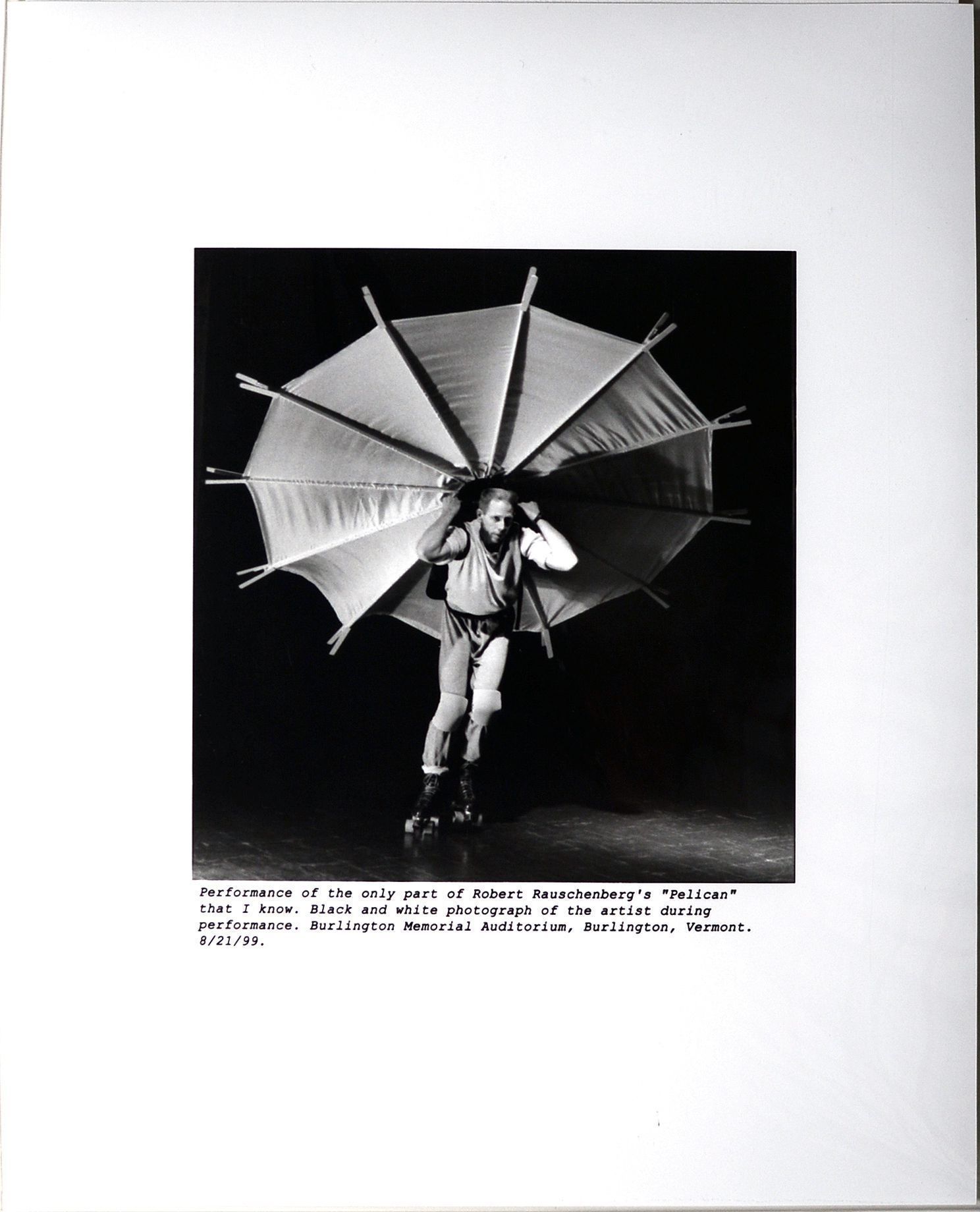 Performance of The Only Part of Robert Rauschenberg’s ‘Pelican’ That I Know. Black and White Photograph of the Artist during performance. Burlington Memorial Auditorium, Burlington, Vermont 8/21/99Entry/Object ID