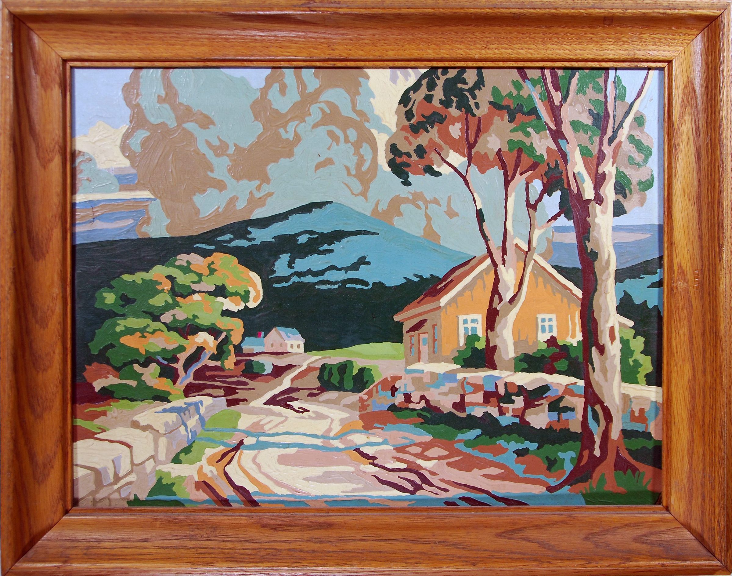 Untitled (Country Houses by Brook w/ Mountain in Background)