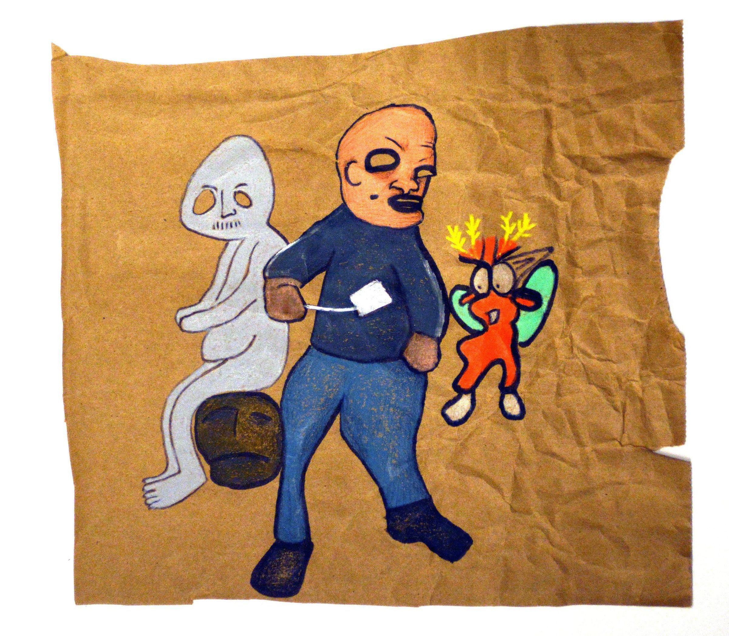 Untitled (three figures, one with fly swatter)