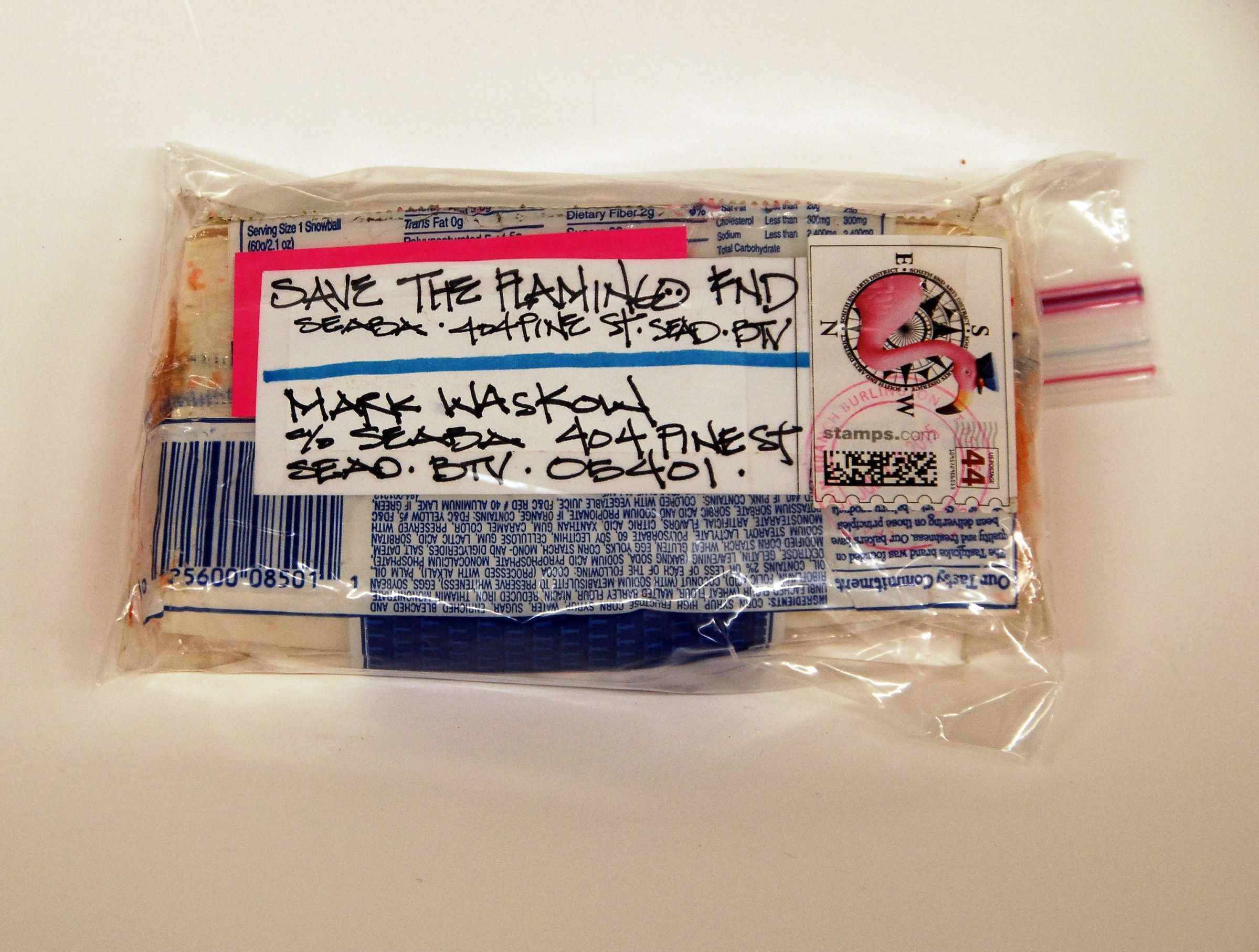 Acquired from the artist, Mail art sent to Mark Waskow on the occasion of his retirement as President of the board of SEABA, Burlington, VT