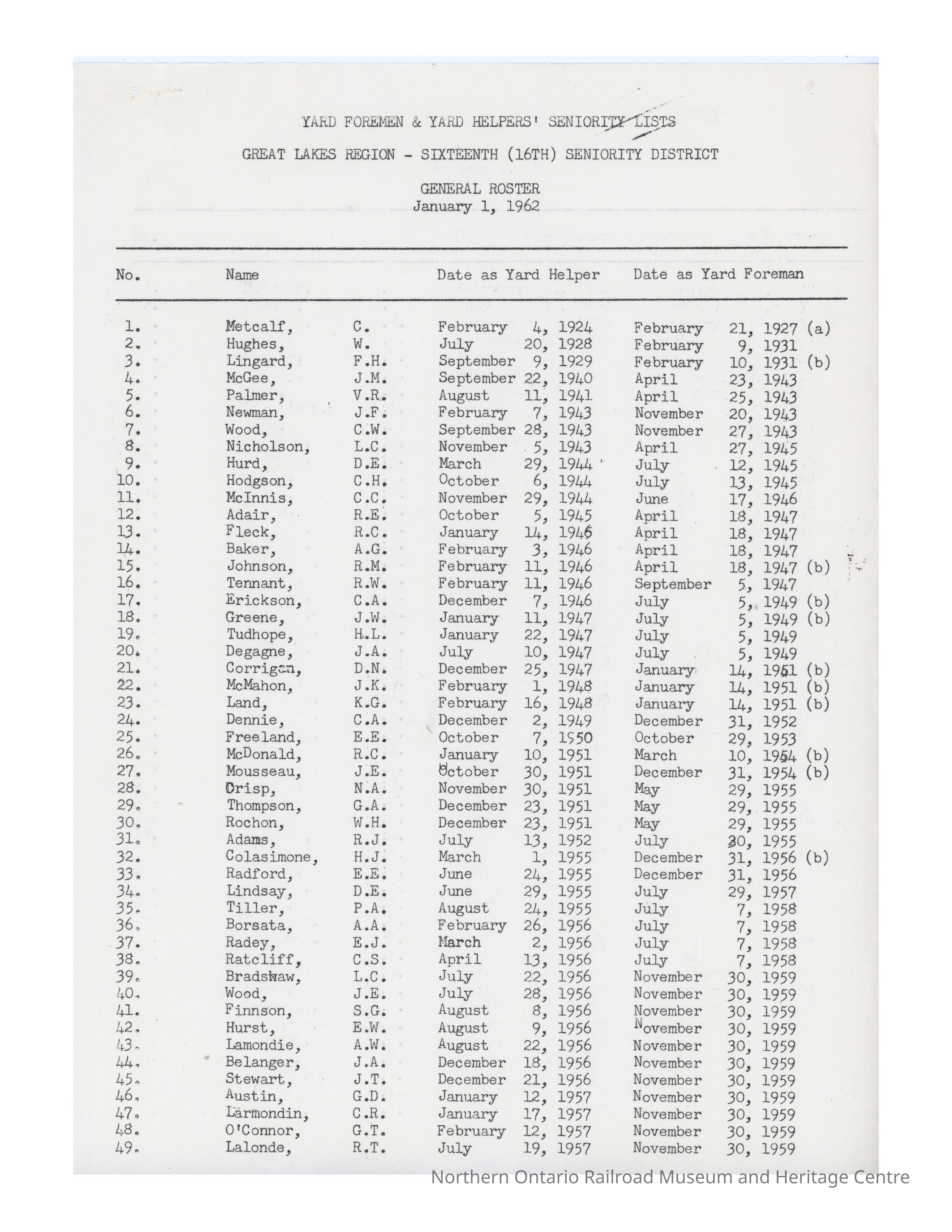 CN Rail- Yard Foremen and Yard Helpers Seniority List, Great Lakes Region - 16th Seniority District- Northern Ontario Area, January 1, 1962Description