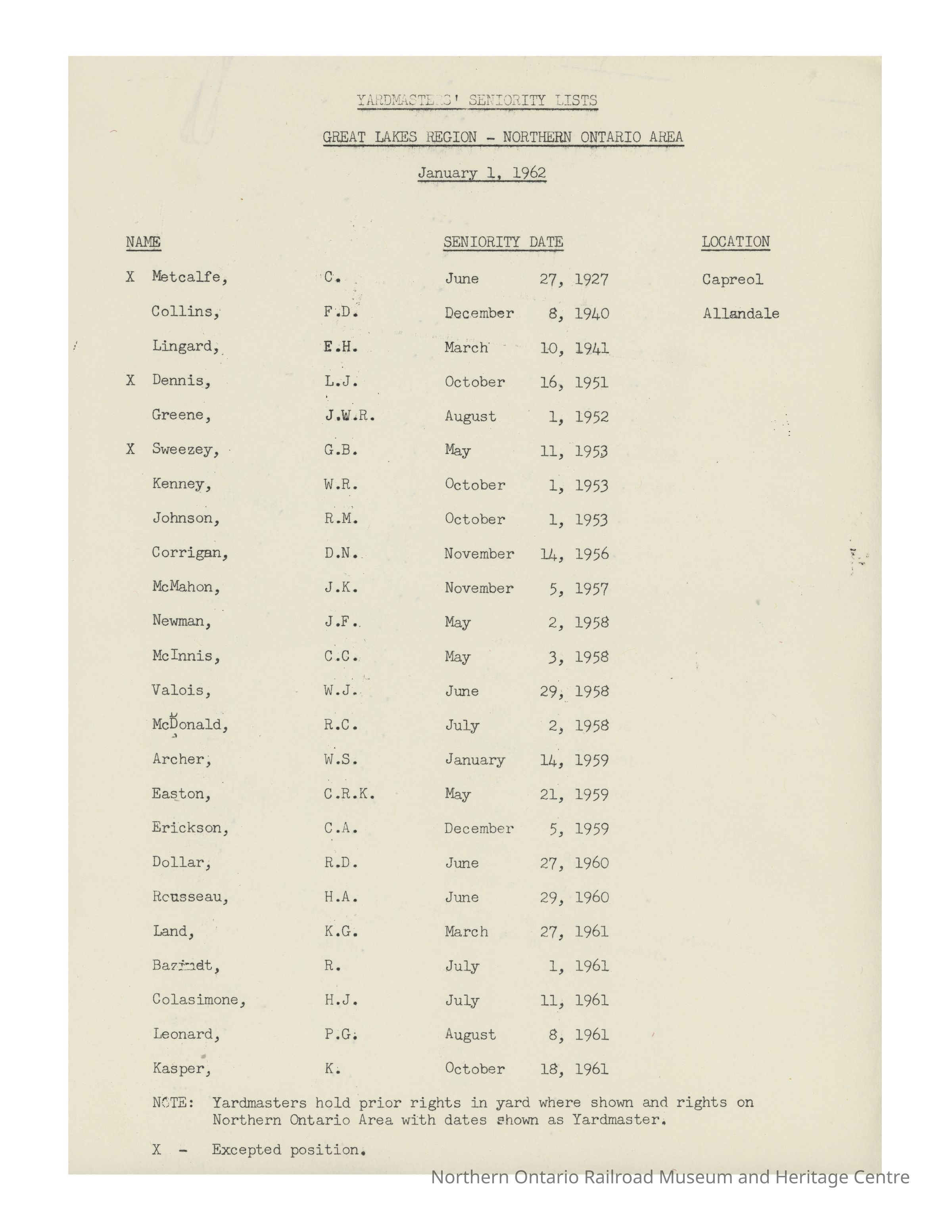 A 1962 seniority list for CN Yardmasters in 15th Seniorty District of the Northern Ontario Area of the Great Lakes Region.Collection