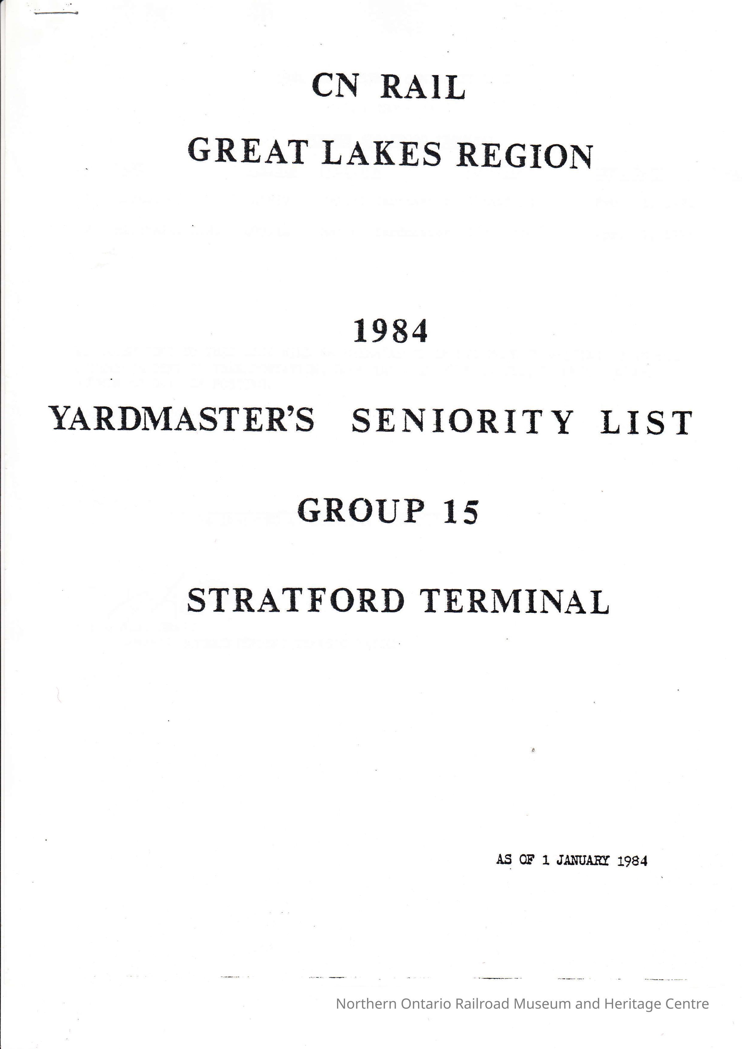 CN Rail-Yardmaster's Seniority Lists, 15th Seniority District Northern Ontario Area, January 1, 1984Description