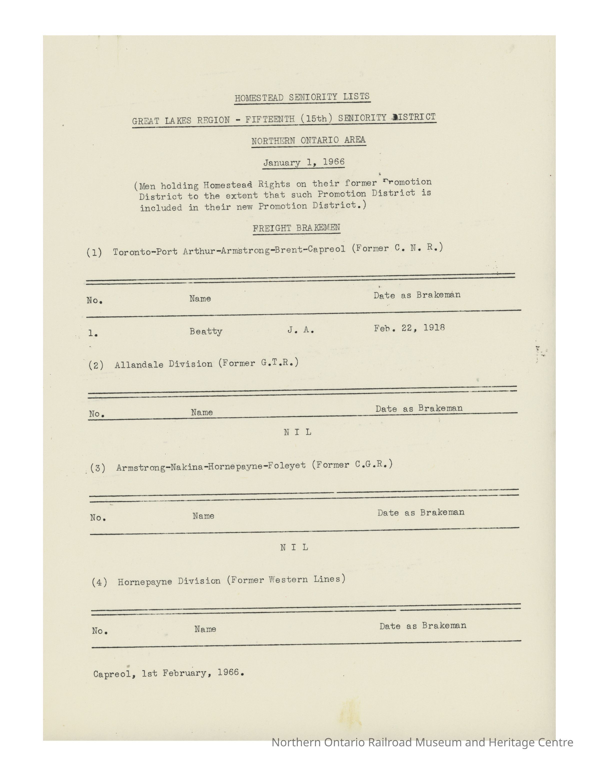 A 1966 homestead seniority list for CN Freight Brakemen in 15th Seniorty District of the Northern Ontario Area of the Great Lakes Region.Collection