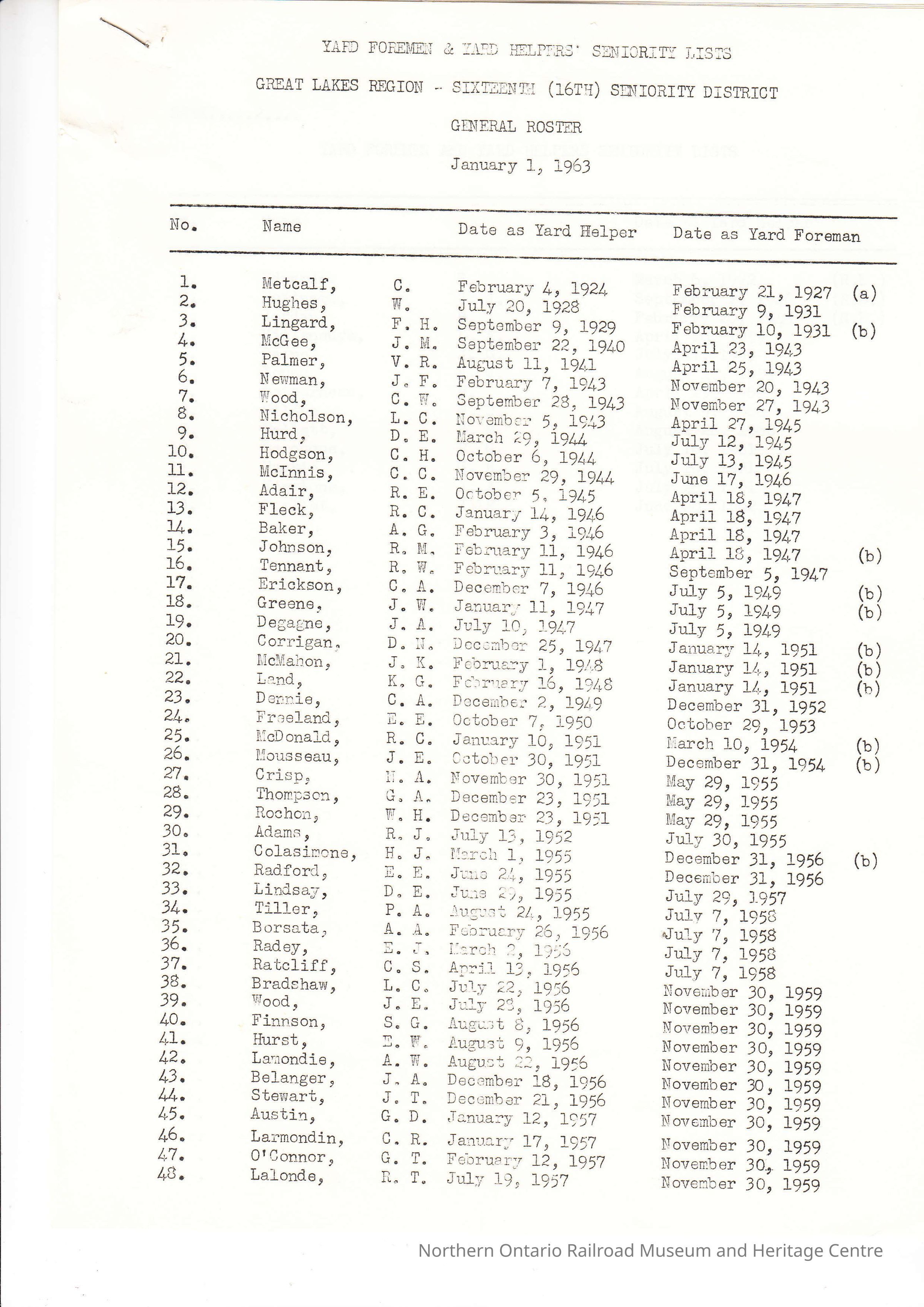 CN Rail- Train Foremen and Yard Helper's Seniority Lists, Great Lakes Region, 16th Seniority District, January 1, 1963Description