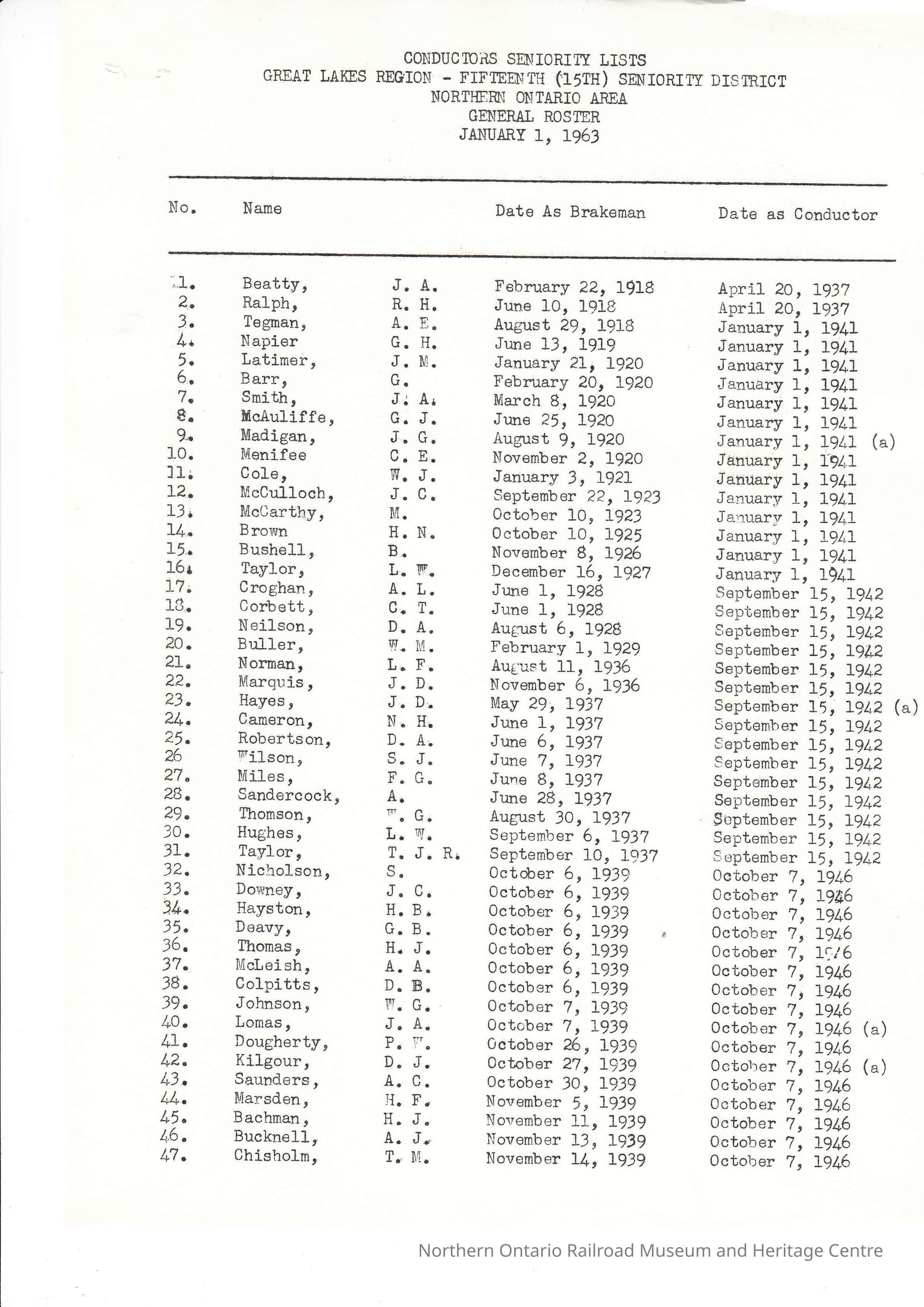 A 1963 seniority list for CN Conductors in the 15th Seniorty District of the Northern Ontario Area of the Great Lakes Region.Collection