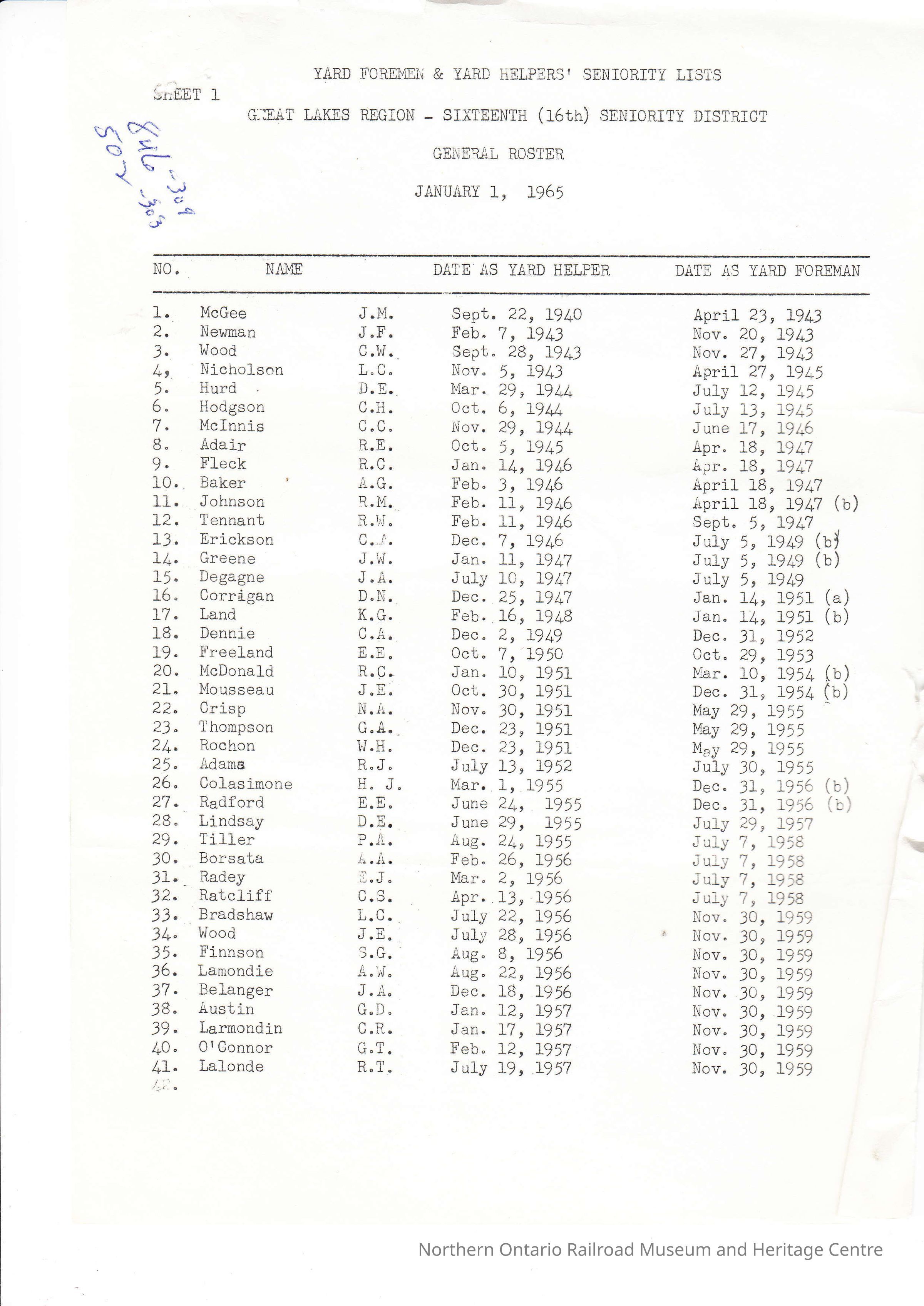 CN Rail- Yard Foremen and Yard Helper's Seniority Lists, Great Lakes Region, 16th Seniority District, January 1, 1965Description