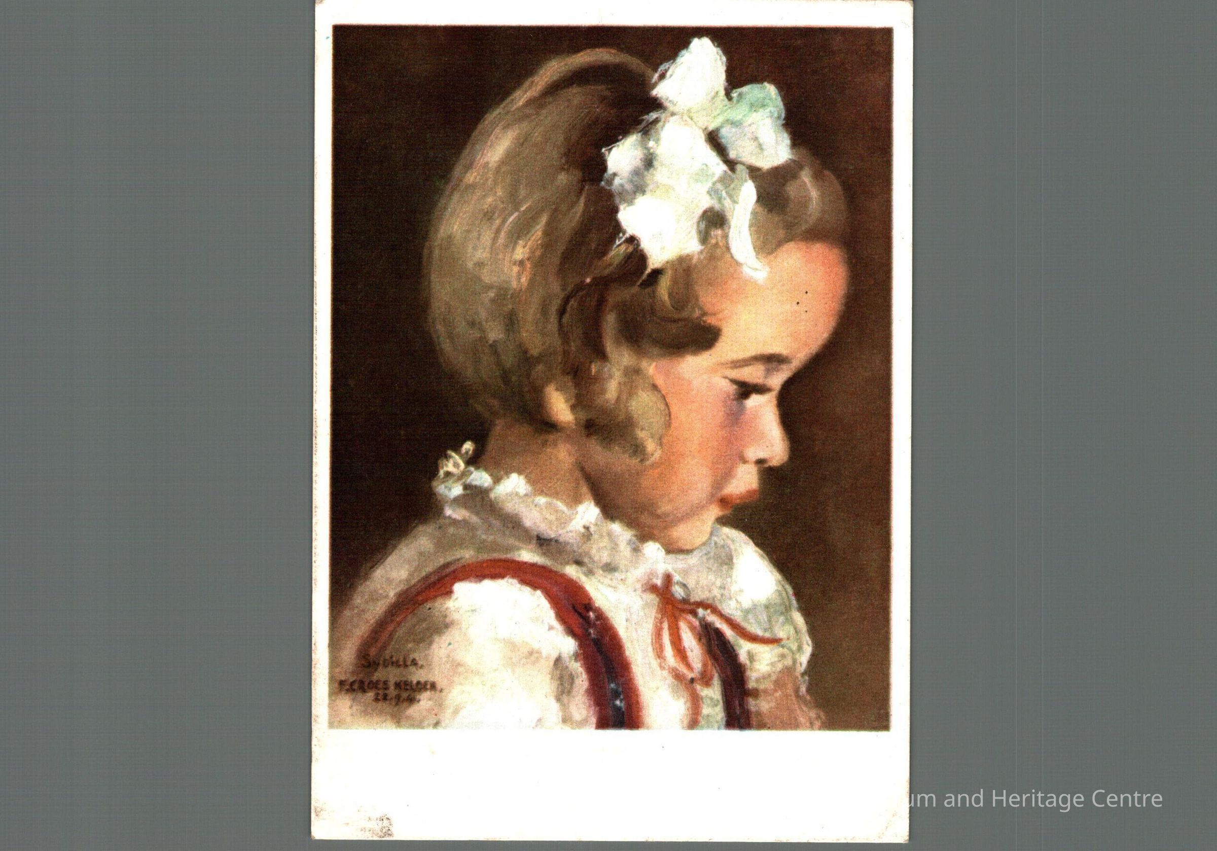 Postcard sent to Mrs. D Carrise in Capreol ON from the Netherlands in 1946. From Minnie and Papa, front is a portrait of a young blonde girl with a white ribbon in her hair. On the back there appears to be some math done, used as scrap paperContext