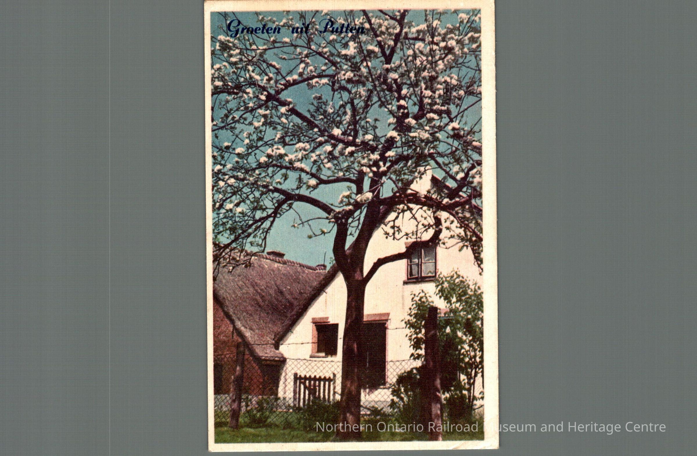 Postcard sent to Mr. and Mrs. M Carrise in Ottawa ON from the Netherlands in 1946. Text is signatures, front image is of a cherry blossom tree in front of a house captioned "Groeten uit Putten"Context