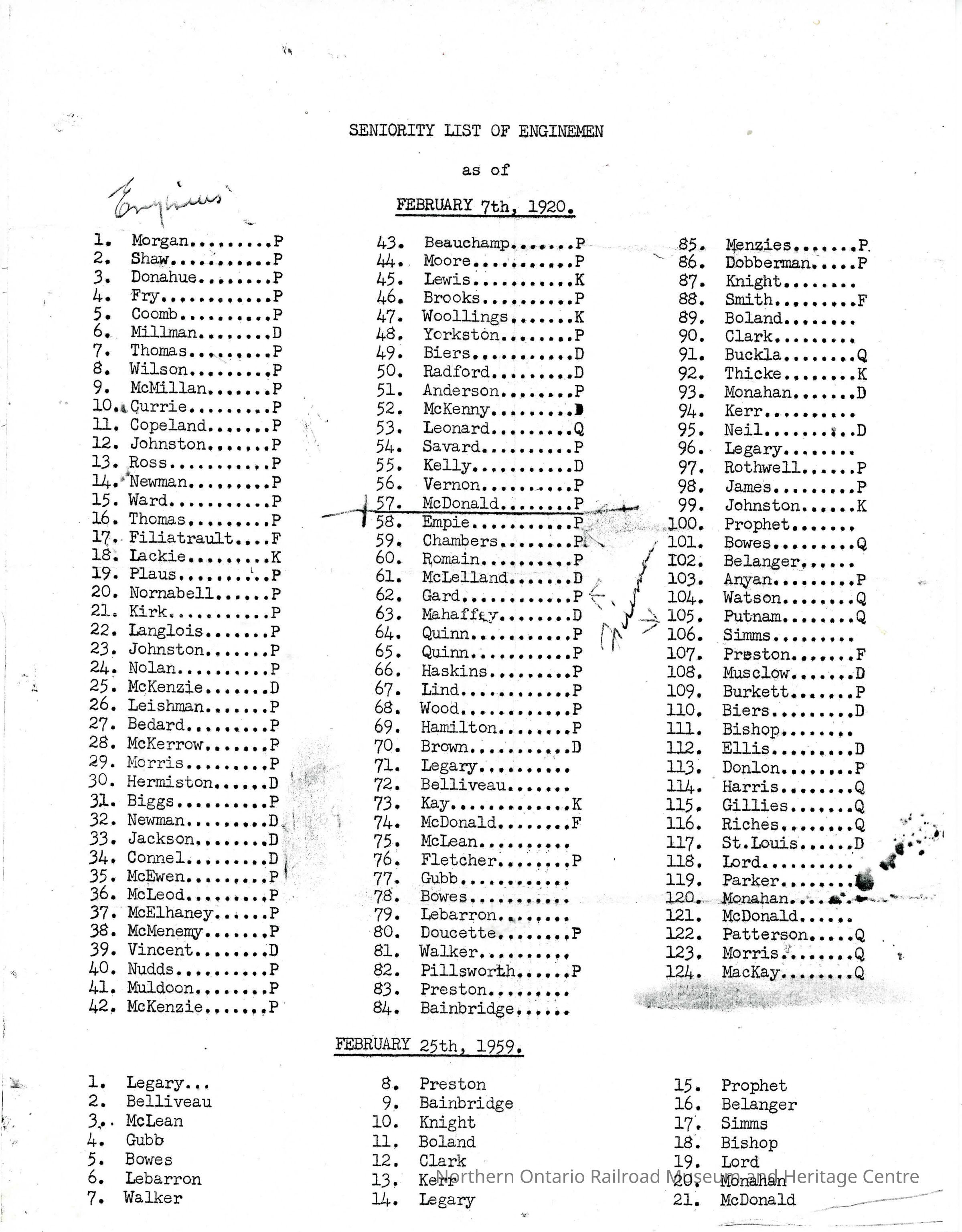 Seniority List of Enginemen as of February 7th, 1920. Temiskaming & Northern Ontario RailwayCollection