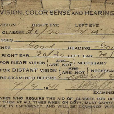 The card features the areas to record: name, occupation, place examined at, age, height, weight, date of re-examination, date of exam, signature of medical examiner, distant vision, right eye, left eye, both eyes, /20, with glasses, without glasses, colour sense, reading, hearing, right ear, left ear, /20, date of reexamination, date of exam, signature of examiner.Context