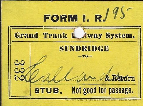 Grand Trunk Railways yellow ticket stub for a trip from Sudridge Ontario to Callender Ontario and also the return ticket. There is a hole punched in the card, it is assumed that the conductor of the train punched the hole into the ticket.