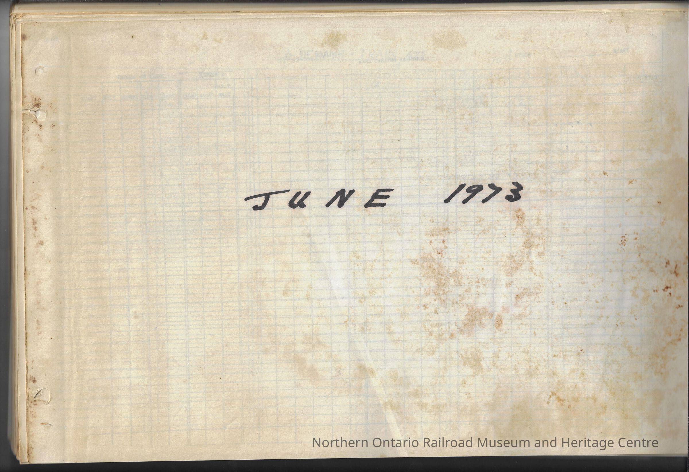 Book, train reports for the Canadian National trains in the Northern Ontario area. This includes all trains coming in and out of Capreol, Hornepayne, and Nakina. It covers: delays, train numbers, days, units, cars, leaving, arrival, losses, time, time lost, time gained, causes for delays, month, date, schedule. It covers the year 1973.