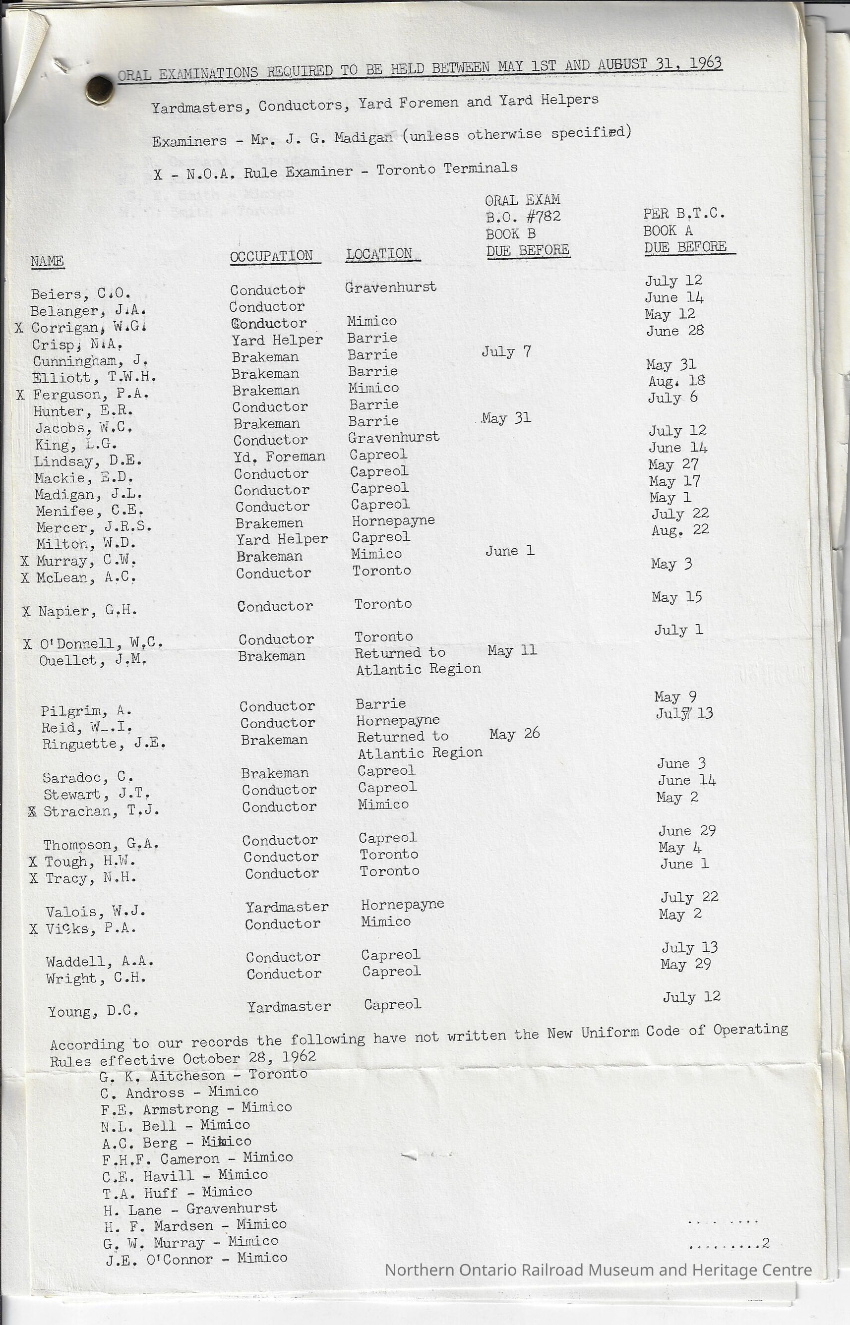 Booklet, compilation of all yardmasters, conductors, yard foremen, yard helpers, enginemen, firemen, agents, operators, dispatchers, maintenance of way department, B & B department, and signal department employees throughout Ontario who are required to complete an oral examination and the dates by which the book "A"s and "B" examinations need to be completed. The booklet lists the employee's name, occupation, location, and the date by which the examinations need to be complete. All examinations are dated between January 1st to August 31st of 1963.