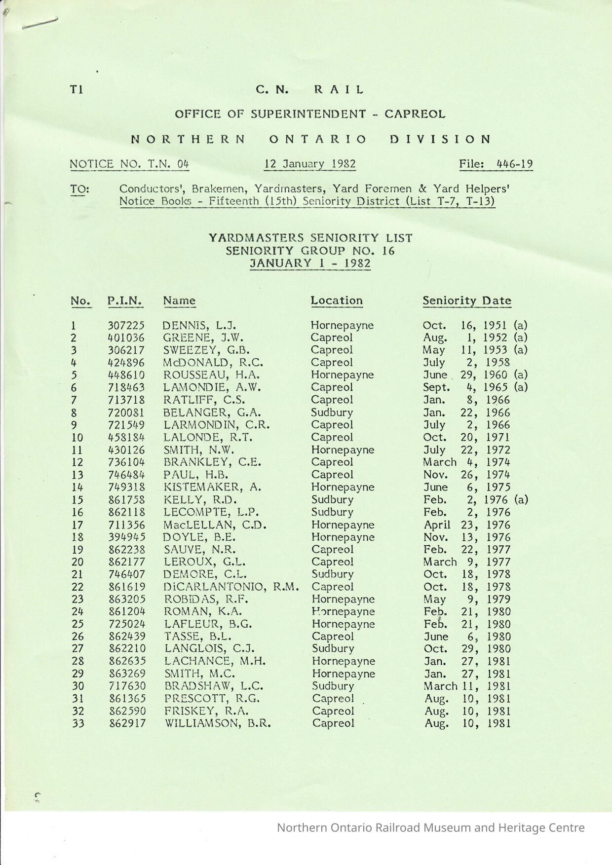 Document, Seniority List, Canadian National Railway, Northern Ontario Division.Collection