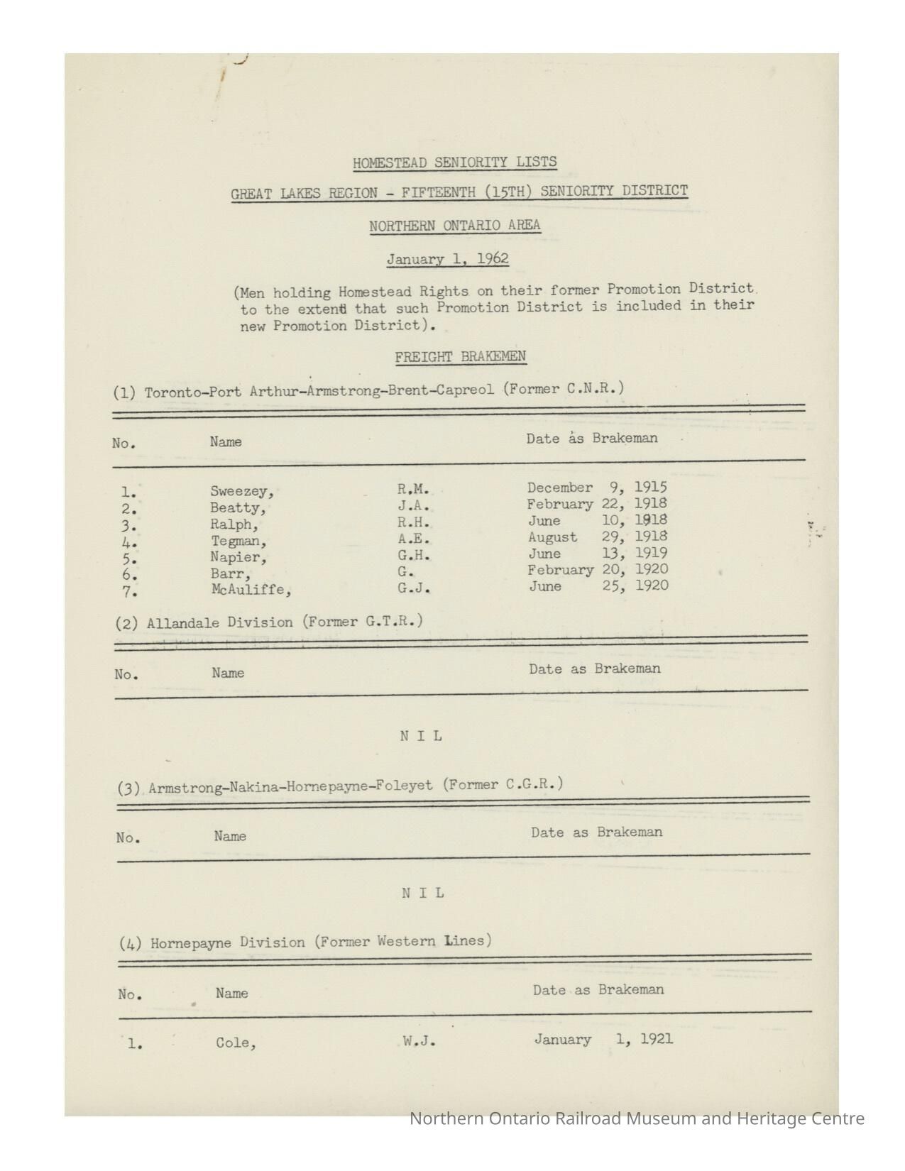 Document, Seniority List, Canadian National Railway, Northern Ontario Division.Collection