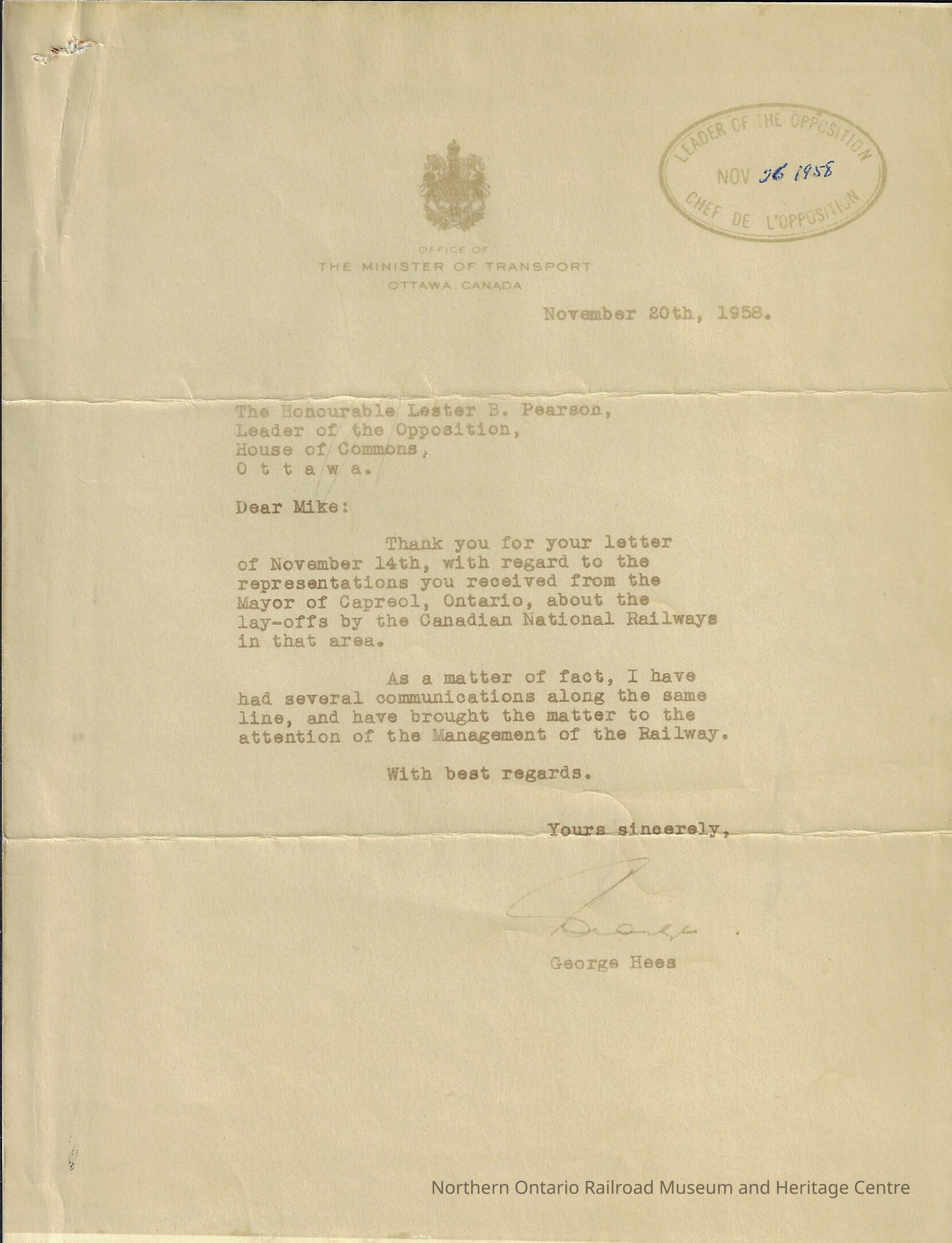 Letter from the Minister of Transport in Ottawa regarding the Canadian National Lay-Offs in 1958.Entry/Object ID