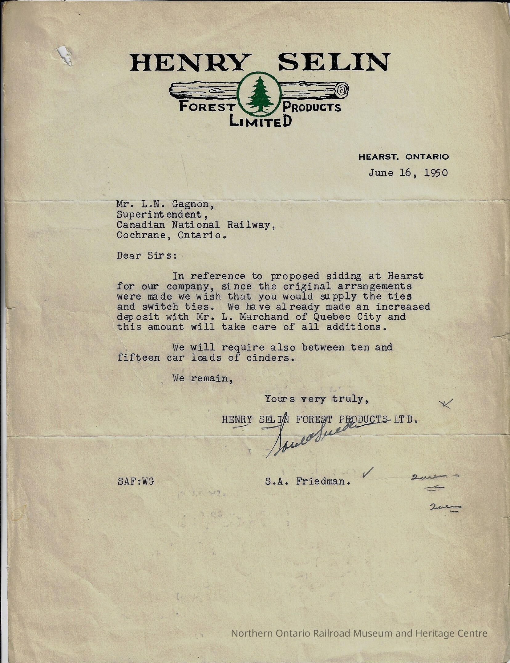 Letter written to L.N. Gagnon, the Superintendent of Canadian National's Cochrane Division in 1950. The letter was sent fro, S. A. Friedman, from the Henry Selin Forest Products company. The letter is regarding a proposed siding project in Hearst for the company and is requesting that Canadian National provides ties, switch ties, and between 10-15 car loads of cinders for the project.