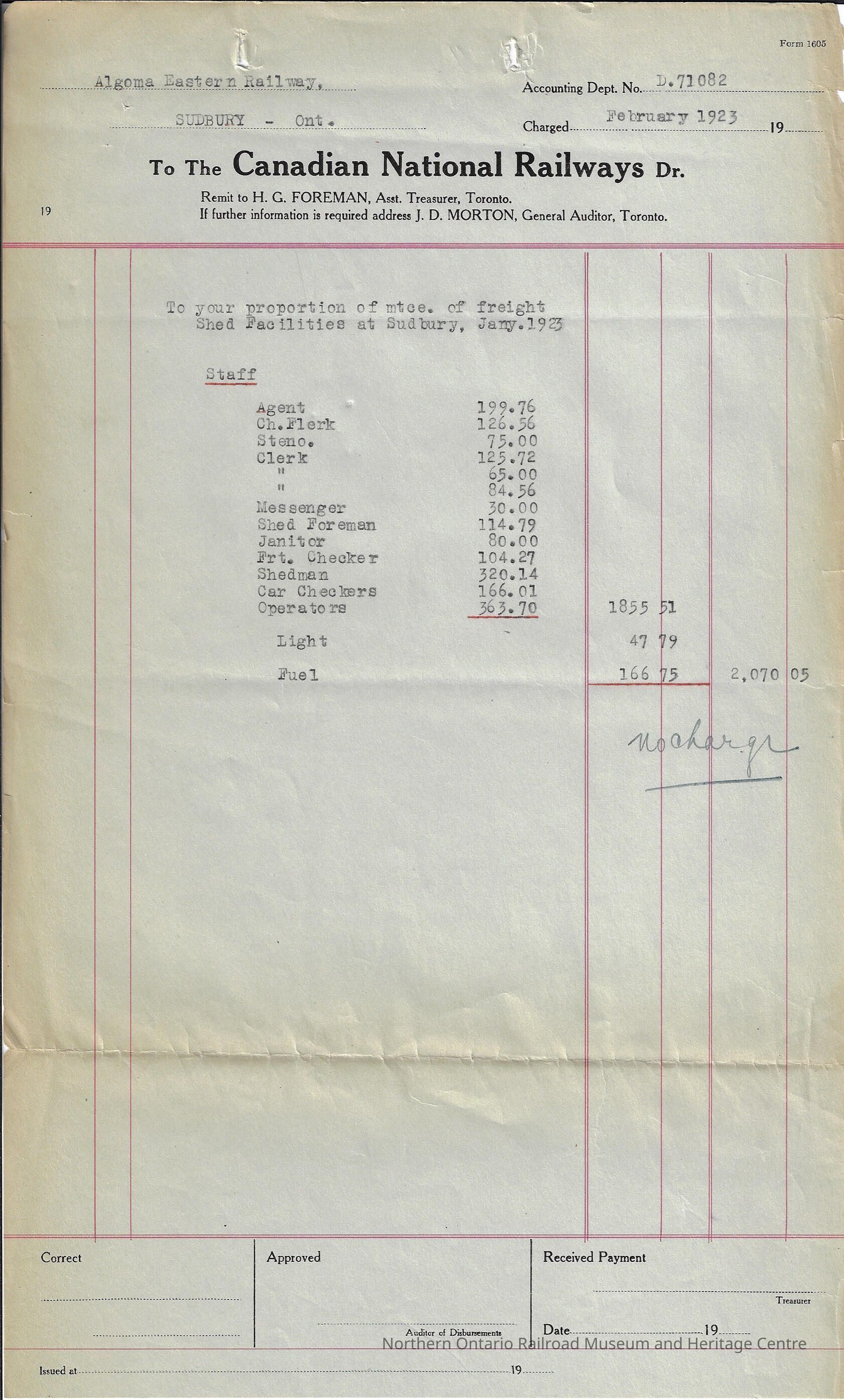 Expense form on behalf of the Algoma Eastern Railway in Sudbury sent to Canadian National. The form dictates that it is for Canadian National's proportion of the MTCE of freight shed facilities at Sudbury in January of 1923. It charges them:
