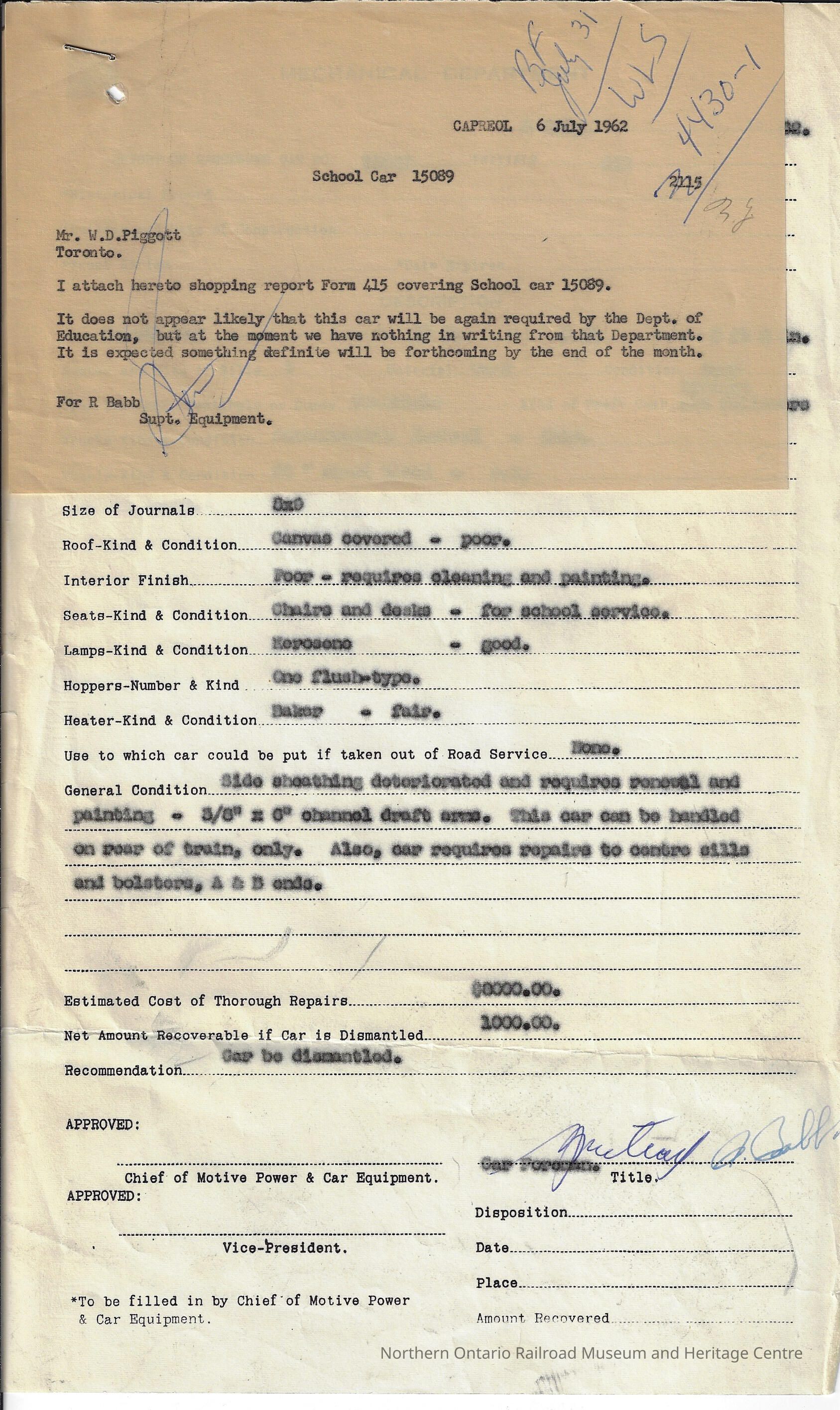 Mechanical department shopping report for Canadian National School Car No. 15089, the report discusses the condition of the structure of the school car and the cost it will take to repair all of the ailments of the car. It was written on the 5th of July, 1962. It covers: