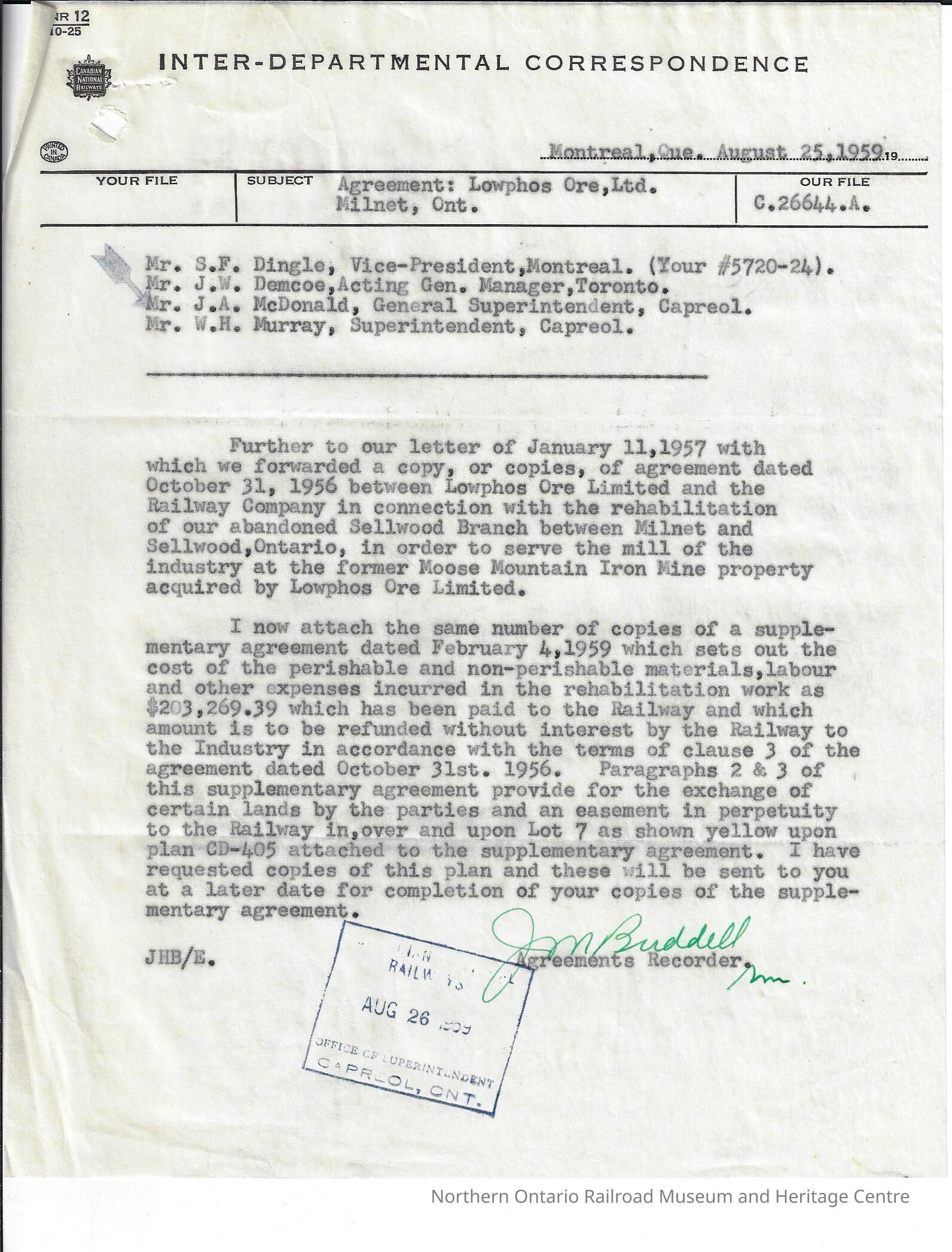 Interdepartmental correspondence sent from the Agreements Recorder in Montreal to the Vice President in Montreal, the Acting General Manager in Toronto, the General Superintendent in Capreol, and the Superintendent in Capreol. The letter is simply stating that the agreements recorder has recieved the agreement between Canadian National and Lowphos Ore and that he is sending the above listed copies of the supplementary agreement dated February 4th, 1959. He will also be sending along copies of the agreement dated October 31st 1956.
