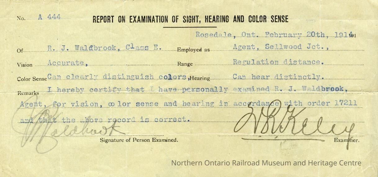 Document, Canadian National Railways Vision, Color Sense and Hearing Certificate, RJ Waldbrook, February 20 1914.Collection