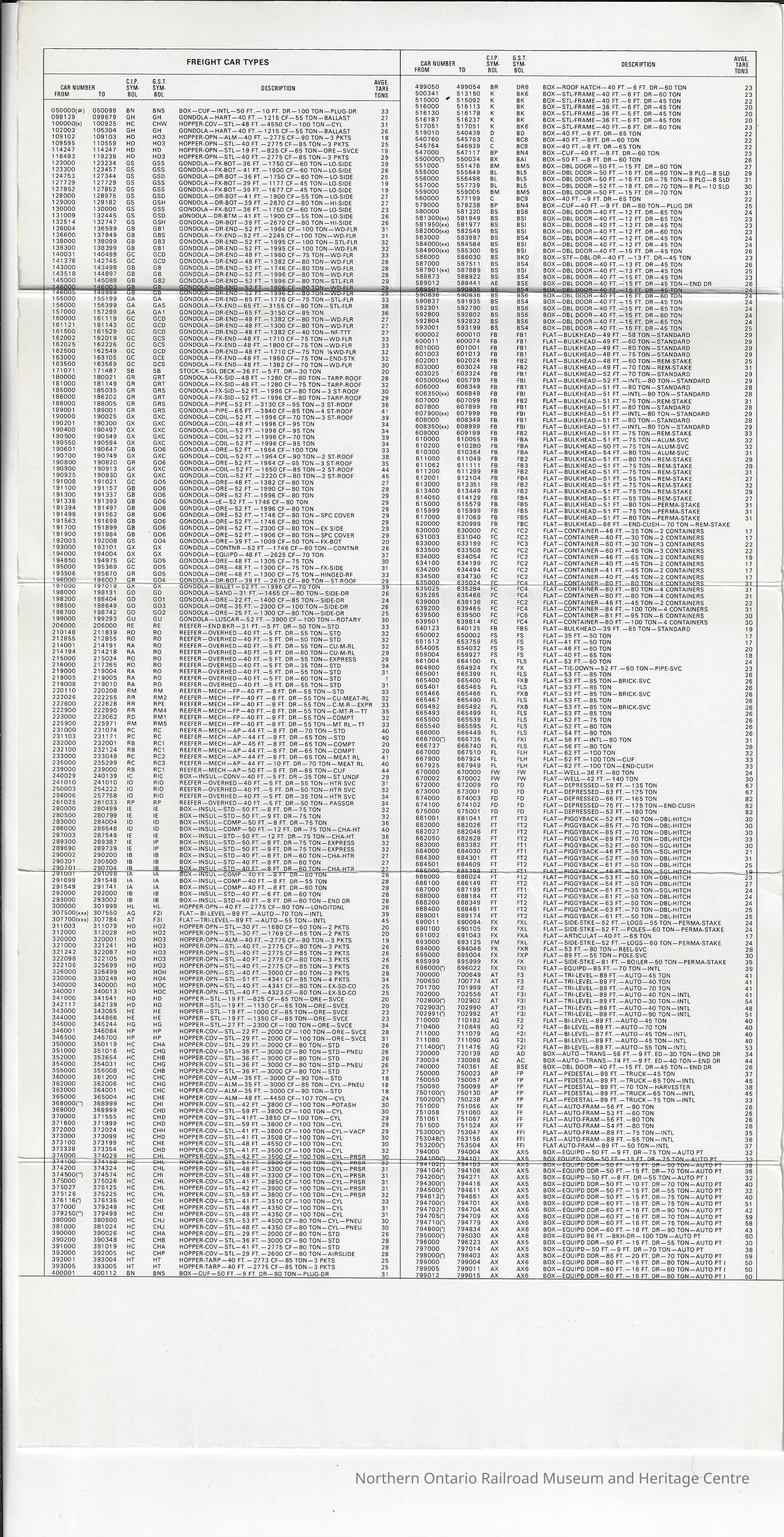 Pocket Guide, pamphlet of a list of Canadian National Freight Car Types, CN 950 (12-74) 48-07-447. The pamphlet opens to list all of the types and categorizes them by: car number, C.I.P. SYM-BOL, G.S.T SYM-BOL, description, average tare tons. The list was provided to employees to interpret symbols assigned to freight cars that are both CN and foreign.