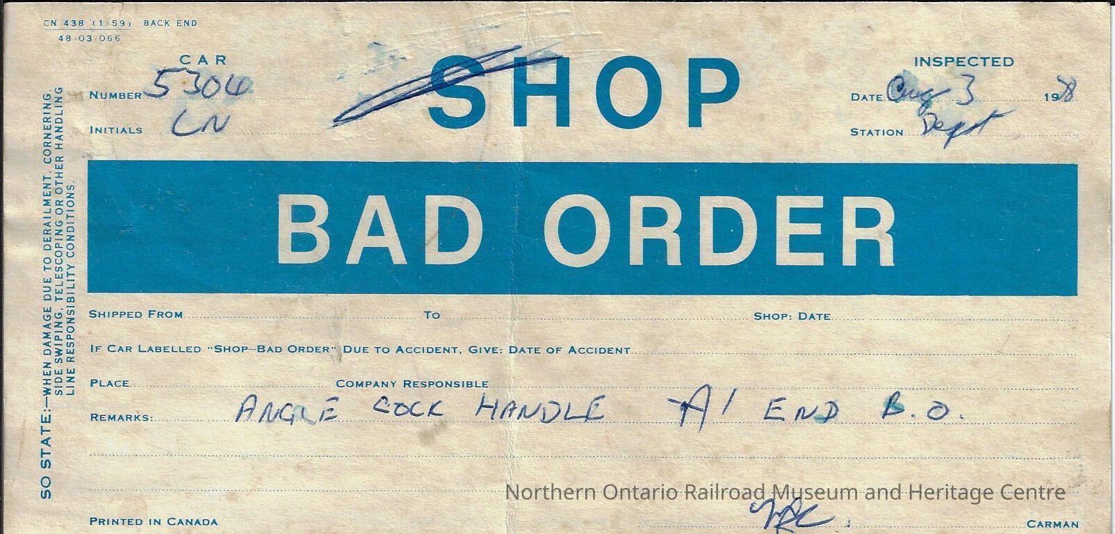 Original document used by Canadian National shops to report on bad orders and repairs needed.