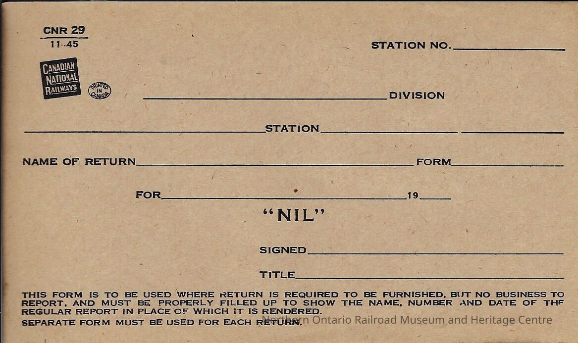 Canadian National branded Return Shipping Form used for shipments that are being returned back to the sender. The form itself is blank however it includes the spaces to record: station number, division name, name of return, form number, signed, title, where it is being returned to.