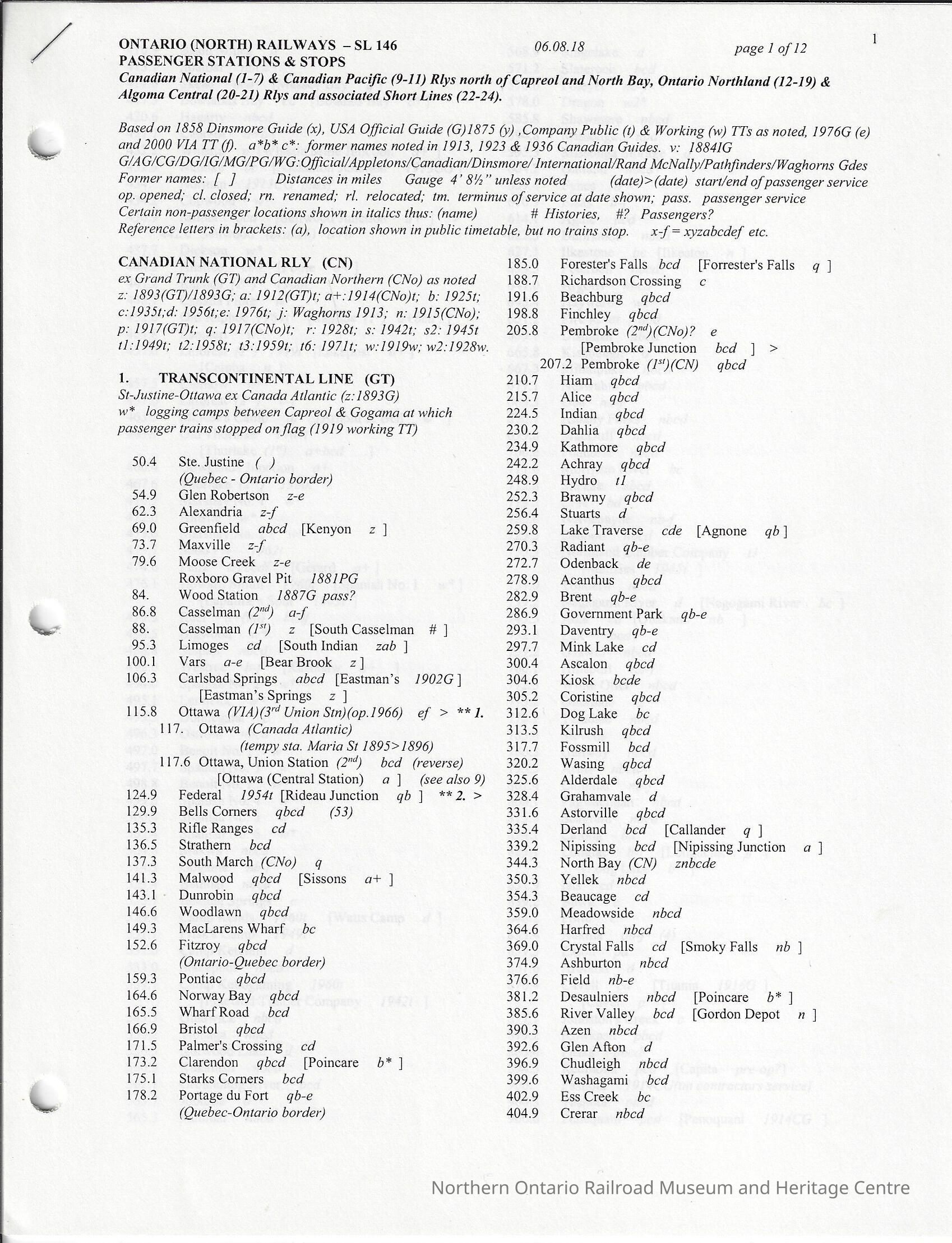12 page list of all of the railway stations and stops in Northern Ontario. It includes: Canadian National, Canadian Pacific, Ontario Northland, and Algoma Central. It covers: Canadian National: transcontinental line, Goodwin-Nakina, Longlac - Thunder Bay North, Thunder Bay-Rainy River, Twin City-North Lake, Thunder Bay- Superior Junction, Canadian Pacific: transcontinental line, Sudbury - Sault Ste Marie, Sudbury - Little Current, Ontario Northland Railway: North Bay - Cochrane, Silver Centre Branch, Earlton - Elk Lake, Englehart - Charlton, Nipissing Central Railway: Iroquois Falls Branch, Iroquois Falls - Timmins, Cochrane - Moosonee, Algoma Central Railway: Sault Ste Marie - Hearst, Hawk Junction - Michipicoten, Lake Huron and Northern Ontario Railway: Mattagami Pulp and Paper Co, Superior and Western Ontario Railway