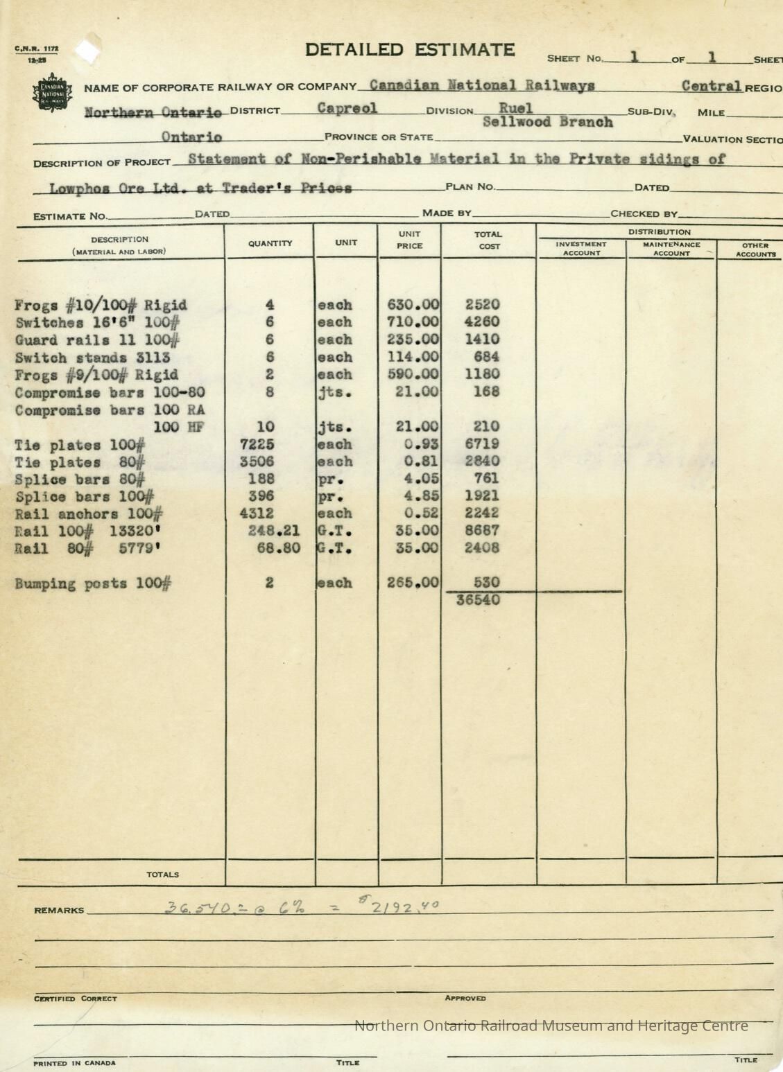 Document, CN Detailed Estimate, Statement of Non-Perishable Material in the Private Sidings of Lowphos Ore Limited, at Trader's Prices.Collection