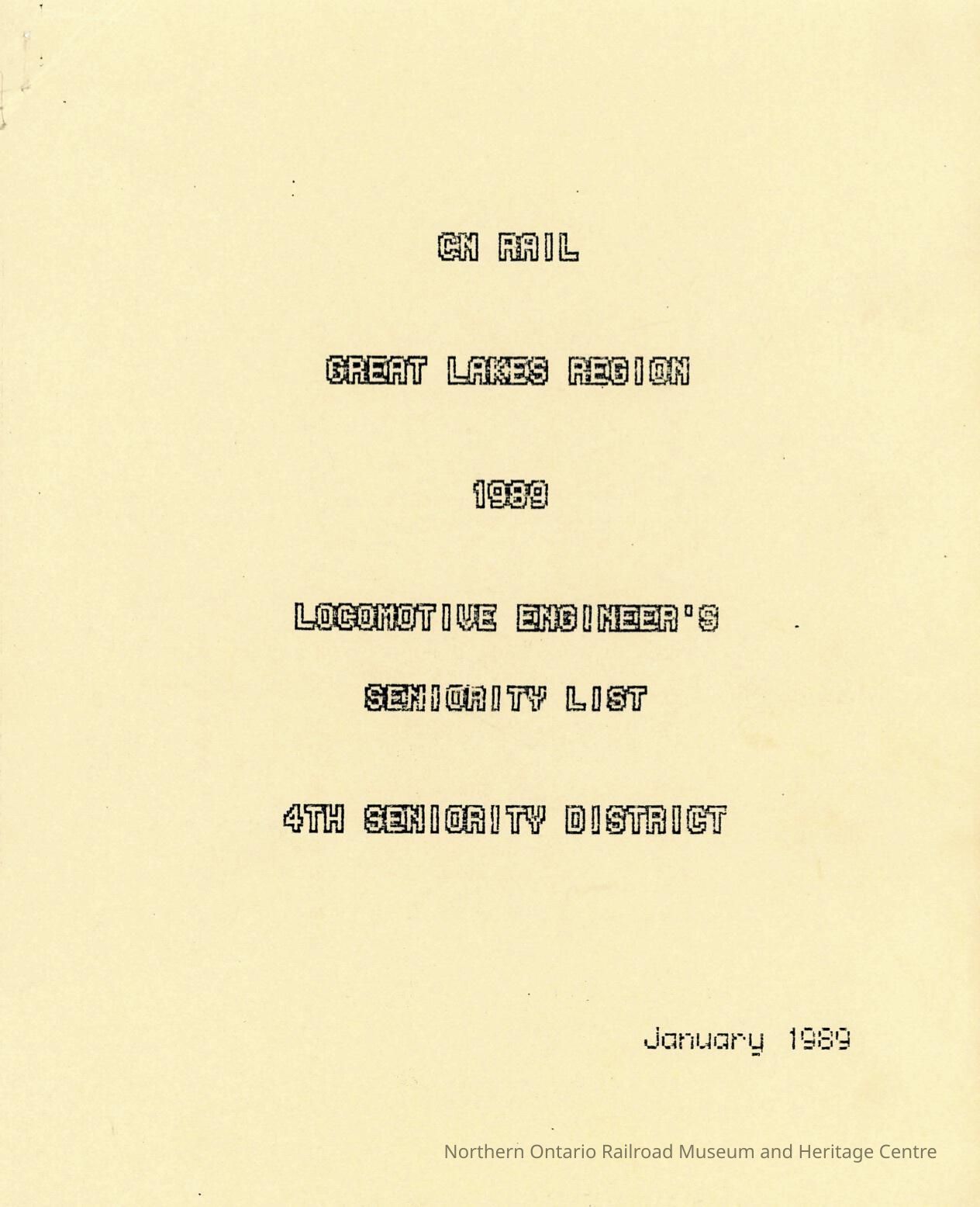Document, CN Rail, Great Lakes Region, 1989, Locomotive Engineer's Seniority List, 4th Seniority District, January 1989.Collection