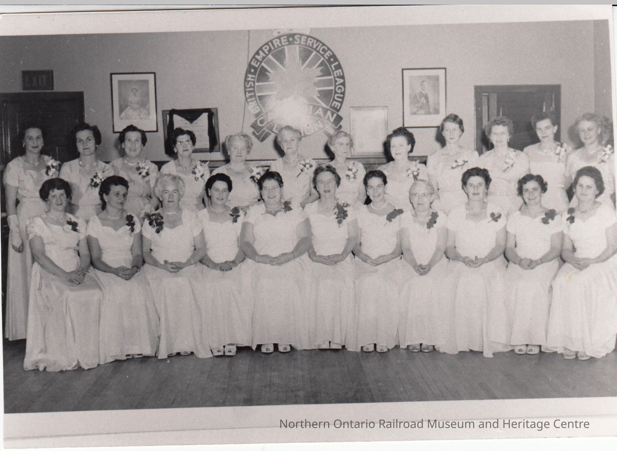 Photograph, CNR Lady Trainmen Drill Team Lodge, Capreol, Ontario, 1955 Bottom Row, L-R: Camila Bertrand, Julie Godin, Cora Edwards, Myrtle Ledingham, Chris O'Connor, Mabel Tetreau, Enid Mohns, Kay Potter, Margaret Watt, Bea Ayrest, Bea Metcalf. Top Row L-R: Jean Clark, Florence Smart, Ethel Kelly, Peg Stewart, Marie Briscoe, Peg Pickett, Violet Hayes, Maise Fitzgerald, Billie Thomson, Ollie Thomson, Bea Fawcett, Martha BellCollection